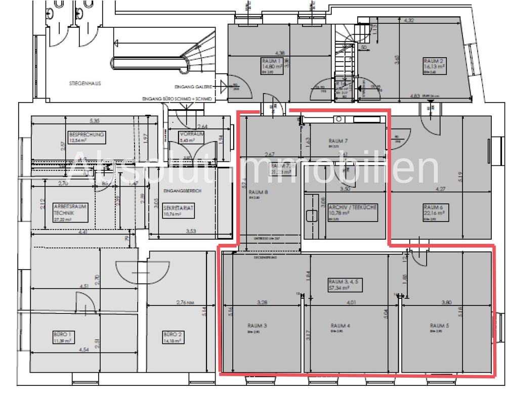 Die Räumlichkeiten, mit ca. 90 m² Nfl. liegen im 1. Obergeschoß und sind wie folgt eingeteilt:
