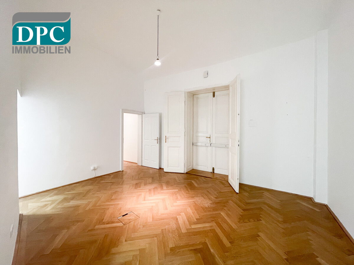 Die Einheit befindet sich im Mezzanin und beeindruckt durch klassische Details wie hohe Räume, Flügeltüren und Fischgrätparkett.
