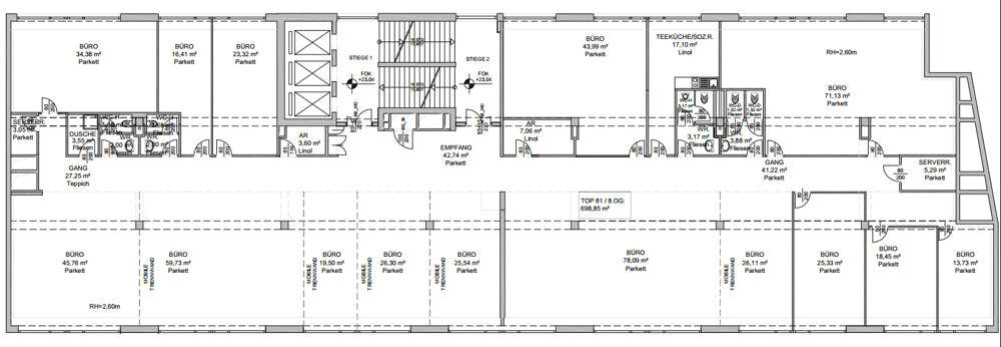 Dieses beeindruckende Mietbürobietet eine großzügige Nutzfläche von 728 m² und steht ab sofort zur Verfügung. Der hochwertige Parkettboden verleiht den Räumlichkeiten eine edle und einladende Atmosphäre, ideal für ein produktives Arbeitsumfeld.