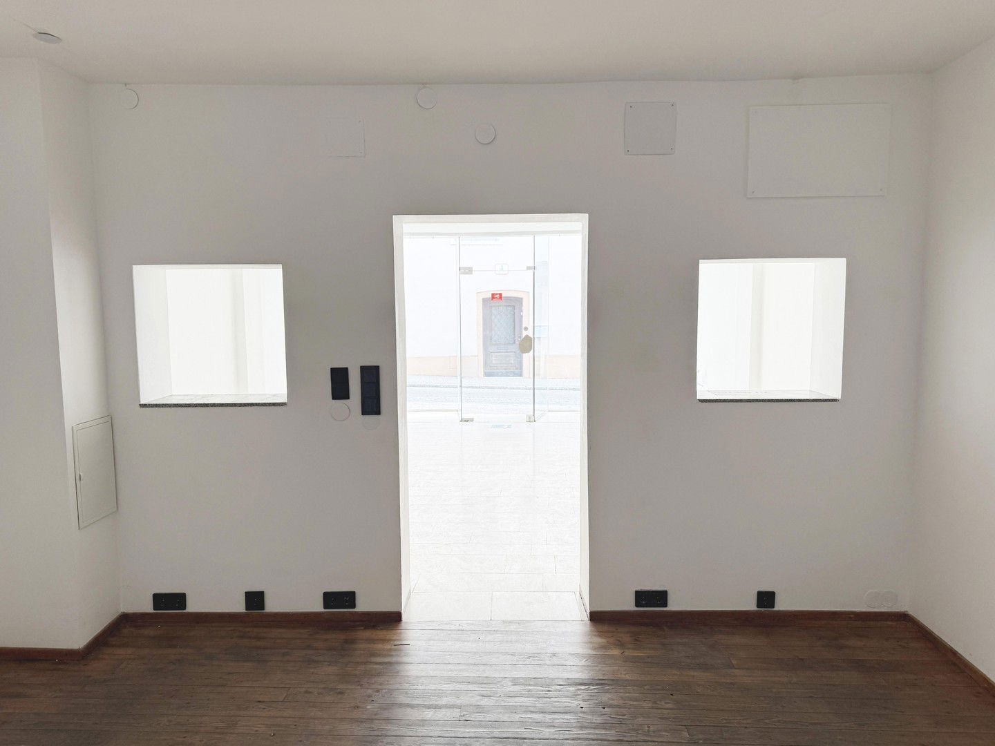 Die Gesamtfläche des Lokals beträgt 40,90m² und teilt sich in einen vorderen Raum mit hellen Bodenfliesen (23,30m²), einem hinteren Raum mit Wasseranschluss und Holzboden (16m²) und einem separaten WC (1,60m²) auf.