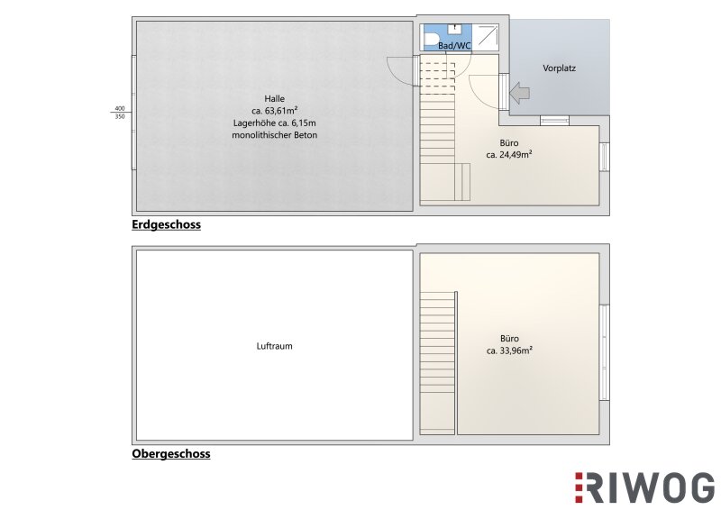 Die Halle ist ebenerdig und mit einem Sektionaltor ausgestattet. Das Büro verfügt über einen eigenen Zugang und einem Bad samt Toilette & Dusche.
