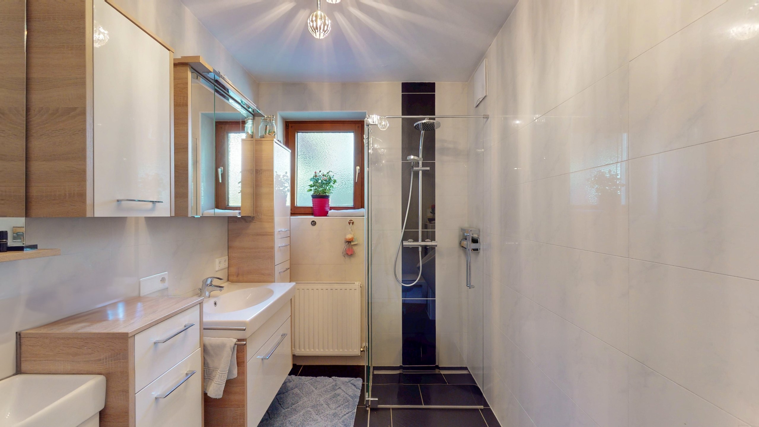 Raumaufteilung: UG: Wellness/ Sauna, Allzweck-/ Hobbyraum, Wirtschafts-/ Technikraum; EG: Eingang/ Stiegenhaus - WHG EG: Vorraum, Bad mit Dusche/ WC, separates Gäste-WC, Schlafzimmer & Kabinett, Küche & Wohnesszimmer - Ausgang Terrasse und WHG 1. OG: Vorraum, Bad mit Badewanne, 2 WC, 2 Schlafzimmer & Kabinett, Essküche, Wohnzimmer - Balkon