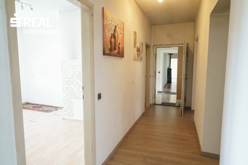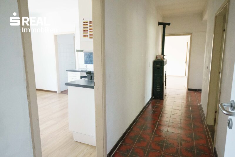 Im ersten Stock gibt es zwei Wohneinheiten (links und rechts vom Stiegenhaus) mit jeweils einer Außenfläche, im Erdgeschoß eine kleinere Wohneinheit die aus einem kleineren Geschäftslokal entstanden ist und ein neu saniertes, vermietetes Geschäftslokal (Kosmetik) mit netto Einnahmen von € 400,-.