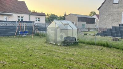 - Frisch gestalteter Gartenbereich mit Gewächshaus