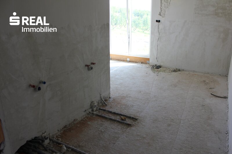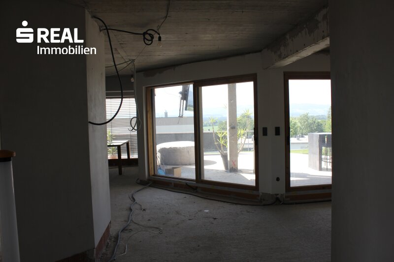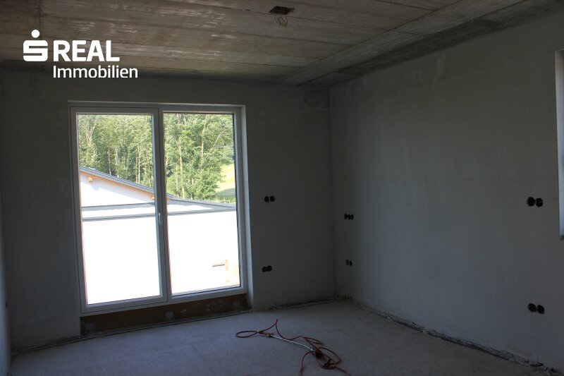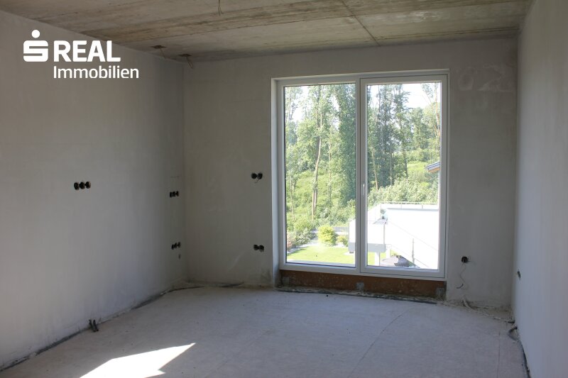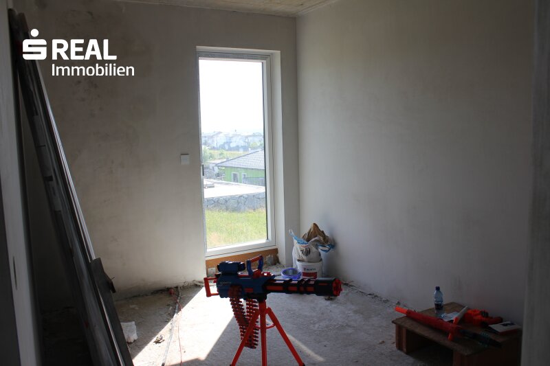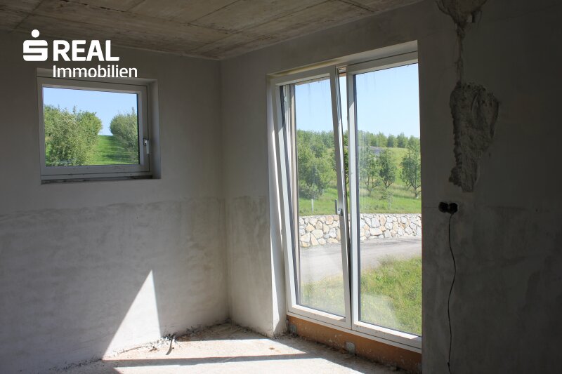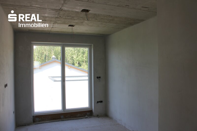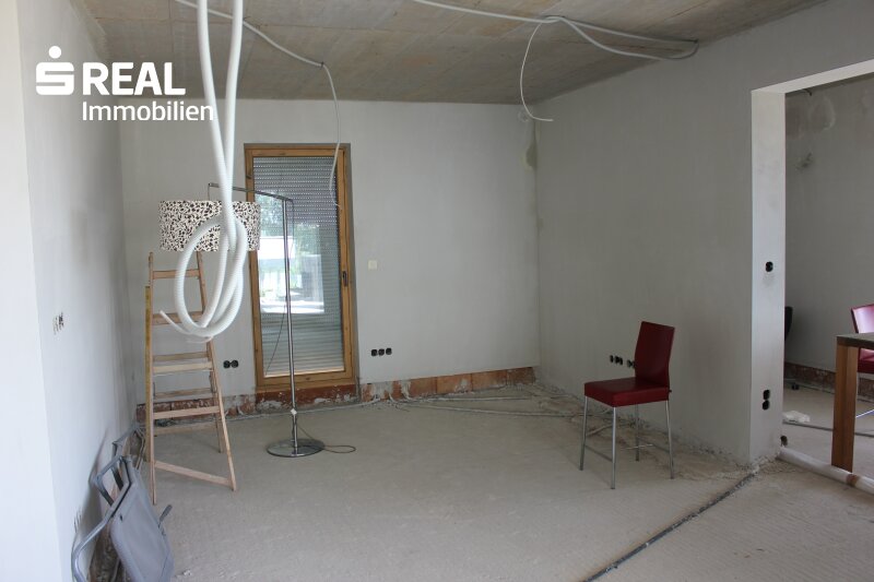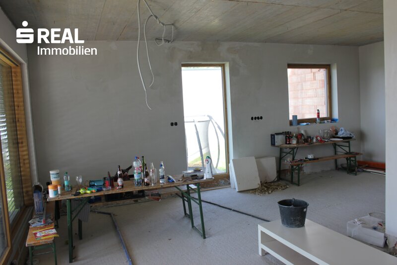 Die gemeinsame Zeit mit der Familie verbringen Sie im geräumigen, offenen Küchen-/Ess- bzw. Wohnbereich mit direktem Zugang ins Freie auf die großzügige Terrasse und den anschließenden Garten. Direkt neben der Küche ist auch eine Speis geplant. Als Alternative zur geplanten Fußbodenheizung (beheizt durch Luftwärmepumpe) können Sie in diesem Bereich auch einen Kachel- oder Kaminofen errichten. Durch die großen Glasflächen können Sie zu jeder Jahreszeit den wunderschönen Blick nach draußen genießen. Zusätzlich gibt es noch einen weiteren Raum, den Sie als Bibliothek, als Büro oder gerne natürlich auch als Gästezimmer verwenden können. Weiters ist noch ein sehr großer Abstellraum (von der Größe her gesehen eigentlich noch ein weiteres Zimmer) vorhanden. Komplettiert wird der Wohnbereich des Erdgeschosses durch ein Badezimmer inkl. Dusche und Gäste-WC.
