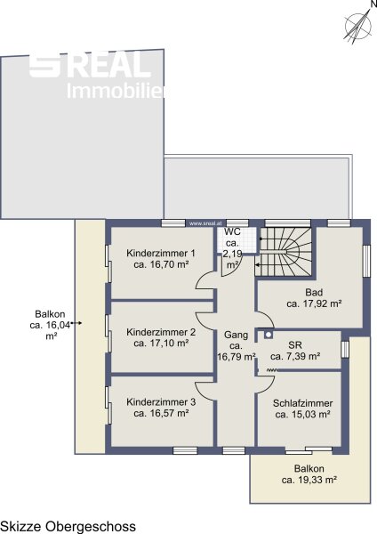 Hier befinden sich insgesamt drei sehr geräumige Kinderzimmer, ein Schlafzimmer mit Schrankraum, das Familienbadezimmer und ein separates WC. Vom Schlafzimmer gelangen Sie auf einen eigenen nach Südosten ausgerichteten Balkon. Bei den 3 Kinderzimmern gibt es jeweils einen Ausgang auf einen gemeinsamen nach Südwesten ausgerichteten Balkon. Auch das Badezimmer mit einer Größe von ca. 18 m² wurde so konzipiert, dass es auch in diesem Bereich keine Platzängste gibt.