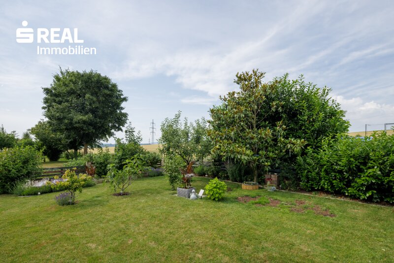 Direkt vom Wohnsalon gelangen Sie auf die schöne, überdachte 21 m² großen Terrasse mit Ausgang in den Garten mit Gartenhaus. Der Garten grenzt zum Teil an Ackerland und bietet damit einen wunderbaren Fernblick und Ruhe. Eine in die Erde eingebaute Regenwasserzisterne mit 2700l Fassungsvermögen versorgt Sie das ganze Jahr mit ausreichend Gebrauchswasser.