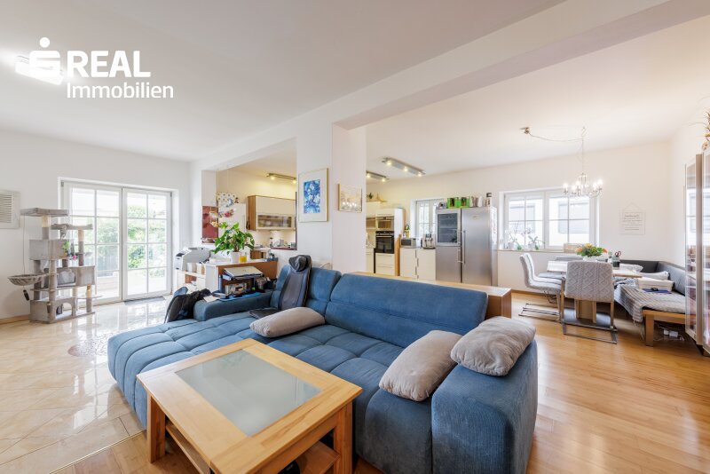 Zur Haustüre gelangen Sie über einen überdachten, mit italienischen Säulen begrenztem Eingangsbereich. Sie betreten die geschmackvolle verflieste Diele mit ausreichend Platz für Garderobe. Zwei Zimmer, links und rechts, bieten sich als Büro oder Gästezimmer an. Anschließend gelangen Sie in den imposantem Wohnsalon mit offener Küche, angeschlossenem Esstisch und einem gemütlichen Kamin-Eck. Die neuwertige Küche der Firma Peter Max ist mit hochwertigen Geräten komplett ausgestattet. Ihre Gäste werden Sie beneiden. Linkerhand liegen zwei Schlafzimmer, beide mit kleinem Balkon, sowie ein komplett eingerichtetes Bad (Whirlpool, Badewanne, Dusche, WC, Bidet, Waschbecken, Fenster). Das zweite Bad mit Whirlpool-Badewanne und bodengleicher Dusche, WC sowie ein extra WC befinden sich rechterhand. Raumhöhen zwischen 2,65 m und 3,15 m.