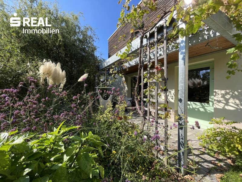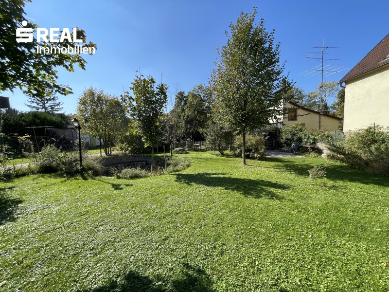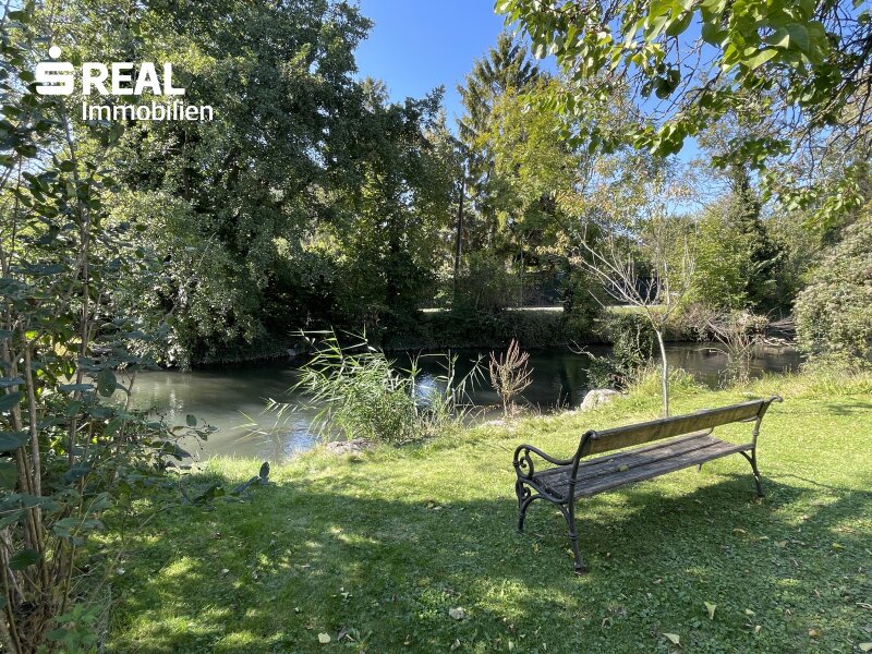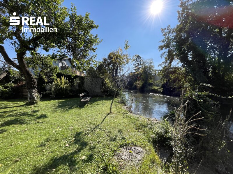 Der wunderschön angelegte Garten mit gepflegtem Rasen (inkl. Rasenroboter) und mehreren überdachten Terrassen lädt zum Entspannen ein und bietet einen unvergleichlichen Blick auf die Fischa, die direkt an das Grundstück grenzt – ein Ort, der Ruhe und Naturverbundenheit vereint.
