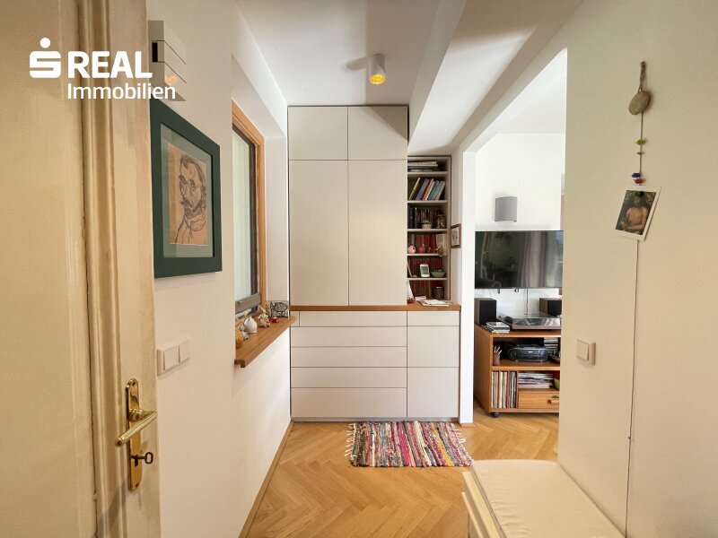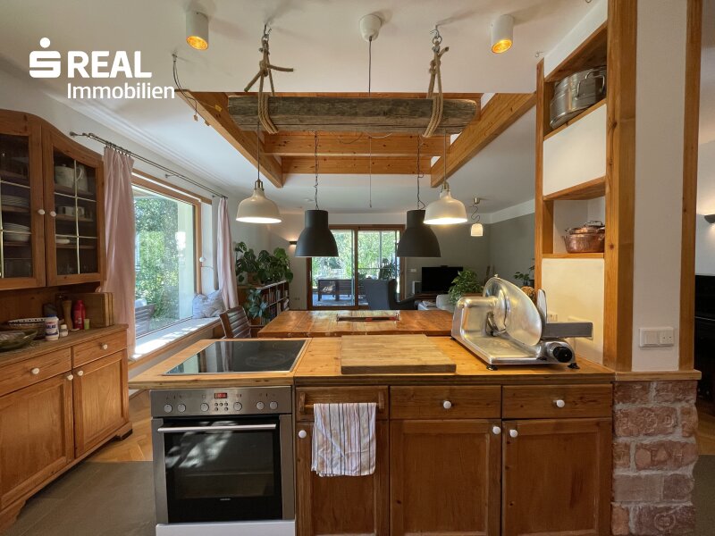 In der Hauptwohnung führt eine Stiege in den großzügigen Wohn- und Essbereich mit einer maßgefertigten Vollholzküche – direkt anschließend befindet sich eine großzügige Speis mit zusätzlicher Küchenzeile, die als erweiterte Arbeitsküche oder praktische Vorbereitungsküche genutzt werden kann.