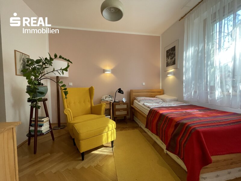 Das Hauptschlafzimmer verfügt über einen offenen Einbauschrankbereich, der durch eine dezente Zwischenwand optisch abgetrennt ist. Der vordere Teil des Raumes öffnet sich zum großen Fensterbereich Richtung Garten und Fischa, wodurch der Raum besonders hell wirkt und einen schönen Ausblick ins Grüne bietet.