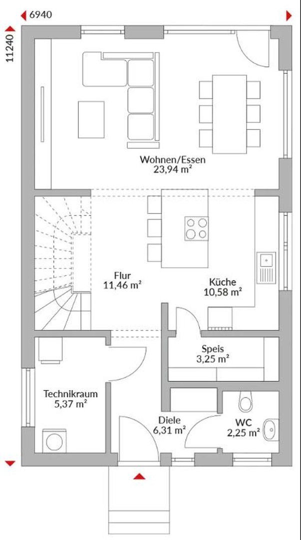 Trotz der geringen Grundfläche erfüllt dieses Haus alle Anforderungen modernen Wohnens. Die Küche ist funktional geschnitten, der Technikraum bietet ausreichend Platz für Haustechnik und Lagerung. Das Badezimmer ist mit Wanne und Dusche ausgestattet, zusätzlich steht ein Gäste-WC zur Verfügung. Die Diele bietet großzügige Garderobenfläche, Kinder- und Schlafzimmer verfügen über gute Stellmöglichkeiten. Der Wohn-/Essbereich überzeugt durch große Fensterflächen und offene Übergänge, die den Raum optisch vergrößern.
