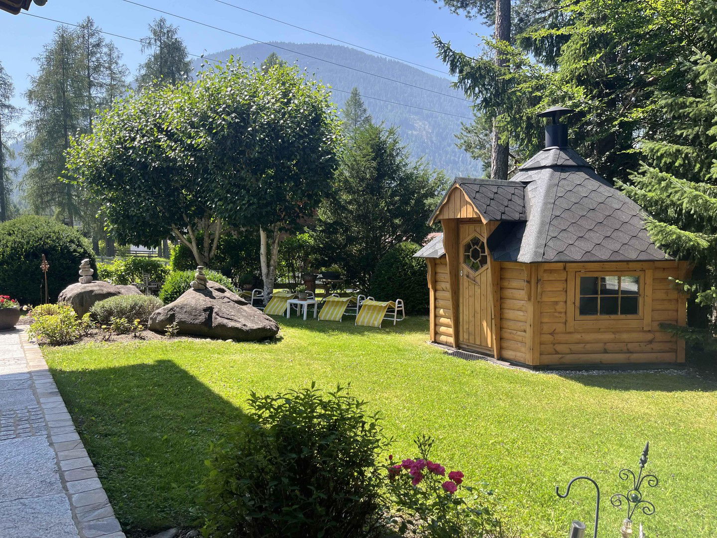 Im liebevoll gestalteten Garten steht ein hochwertiges, vielseitig verwendbares Holzhäuschen.