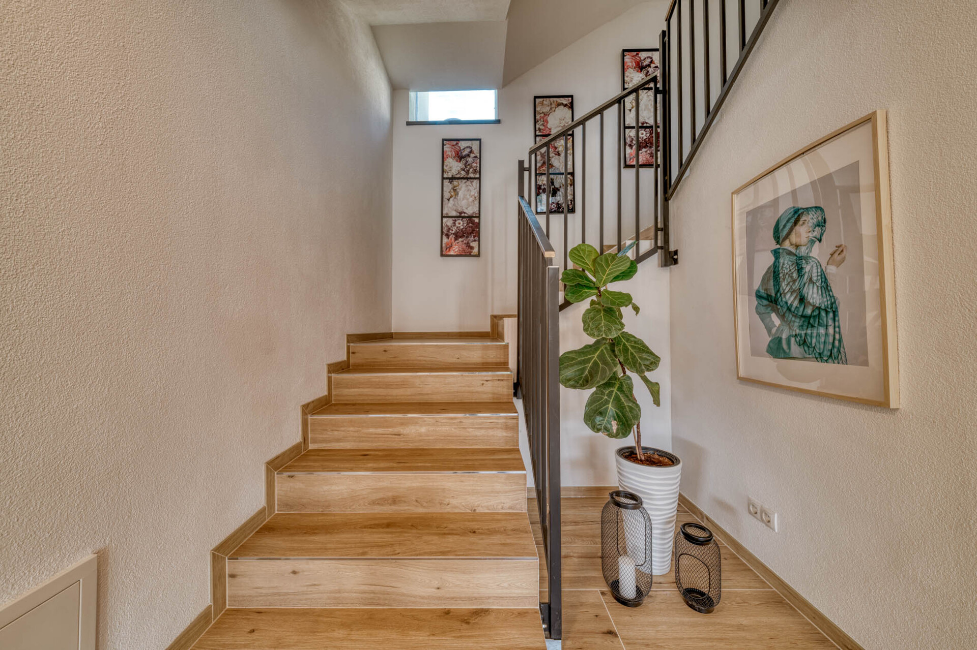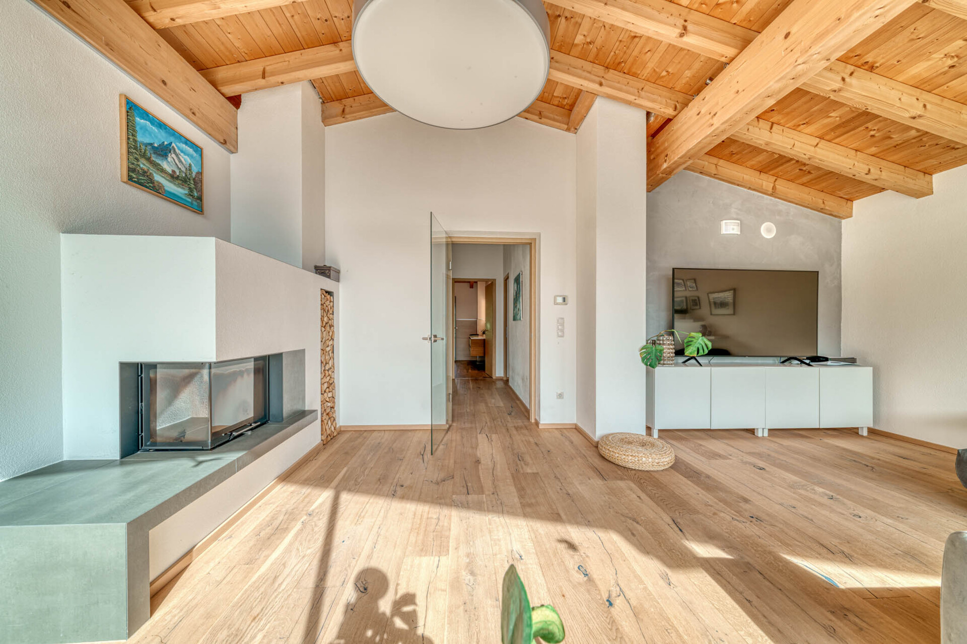 Drei Schlafzimmer, zwei moderne Bäder, ein offener Küchen- und Essbereich sowie das lichtdurchflutete und große Wohnzimmer im Dachgeschoss mit Bürozone bieten höchsten Wohnkomfort. Ergänzt wird das Angebot durch Fitnessraum, Wirtschaftsfläche, Lagerbereiche und eine große Garage.