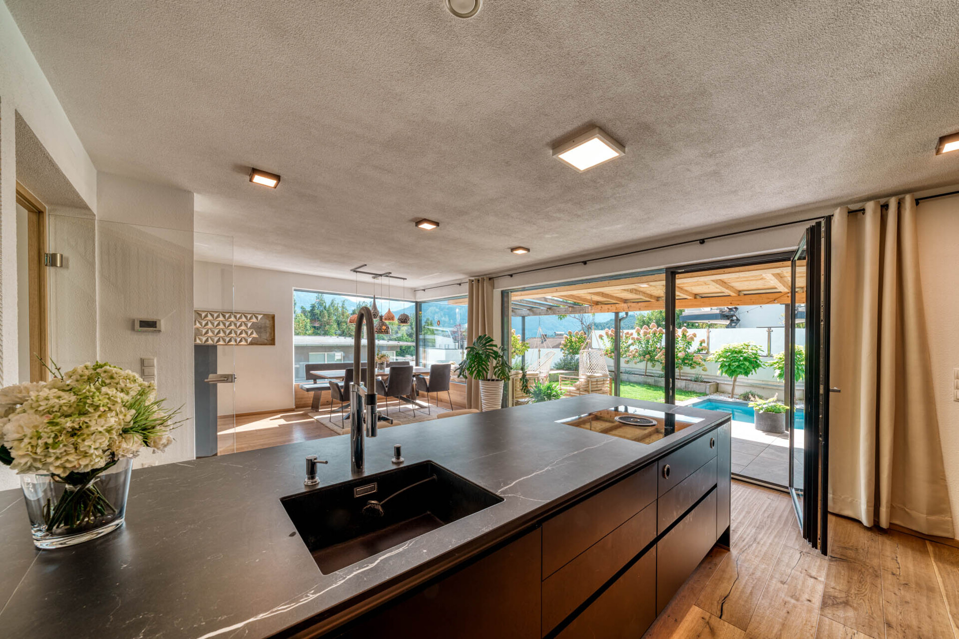 •Küche: Dampfgarer, Backrohr, Bora-Dampfabzug, Induktionsfeld, Keramikarbeitsplatte, Bosch Kaffeemaschine, großzügige Speis, Kücheninsel und viel Stauraum
