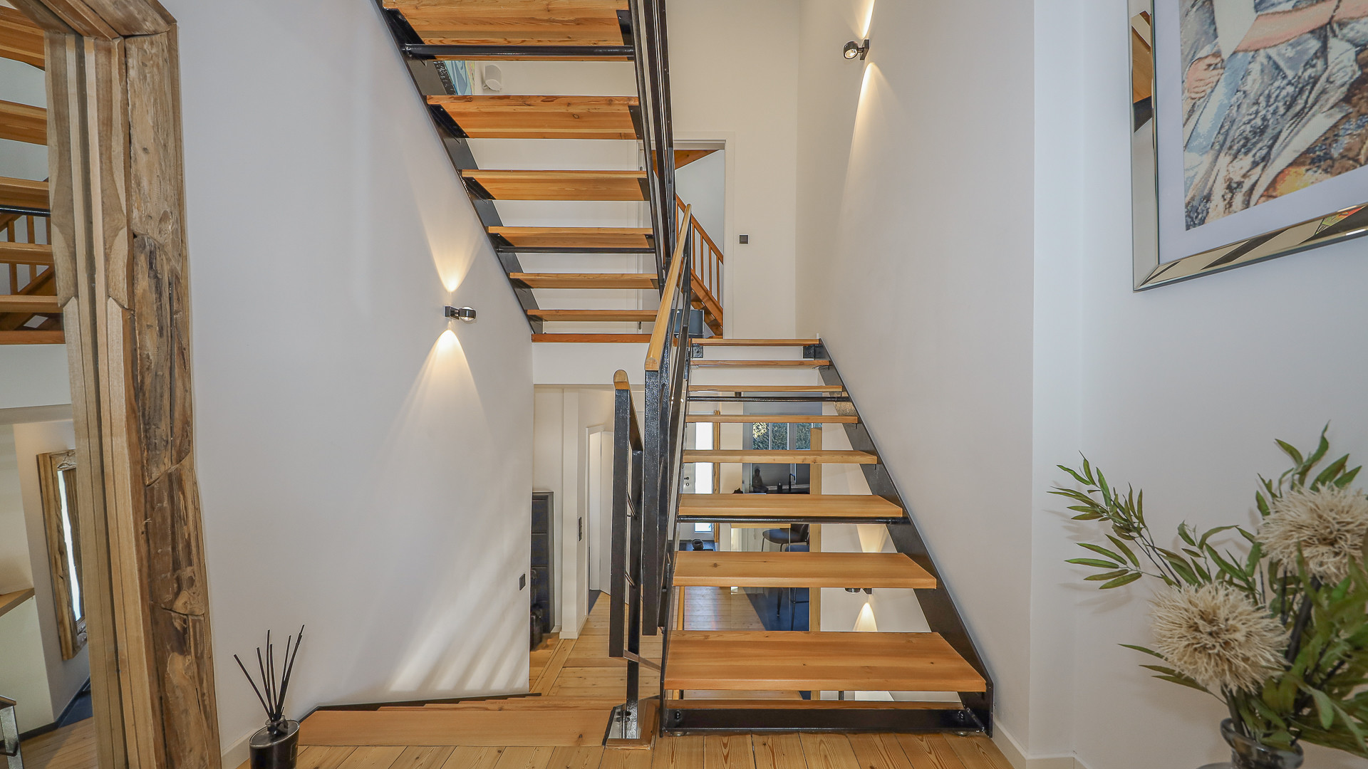 Das Haus wurde 2023 generalsaniert und teilt sich wie folgt auf: im Erdgeschoss befindet sich die Diele, ein Gäste-WC, ein kleiner Abstellraum und die komplett ausgestattete Küche mit Bar.