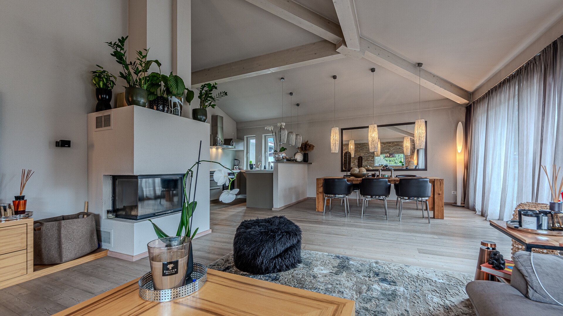 Durch die bodentiefe Fensterfront auf der Westseite gelangen Sie auf die große Terrasse, die einen schier atemberaubenden Blick auf die imposante Bergwelt und den Golfplatz preisgibt. Ein ansprechend designter Kamin spendet Wärme und Behaglichkeit in den kälteren Monaten des Jahres.