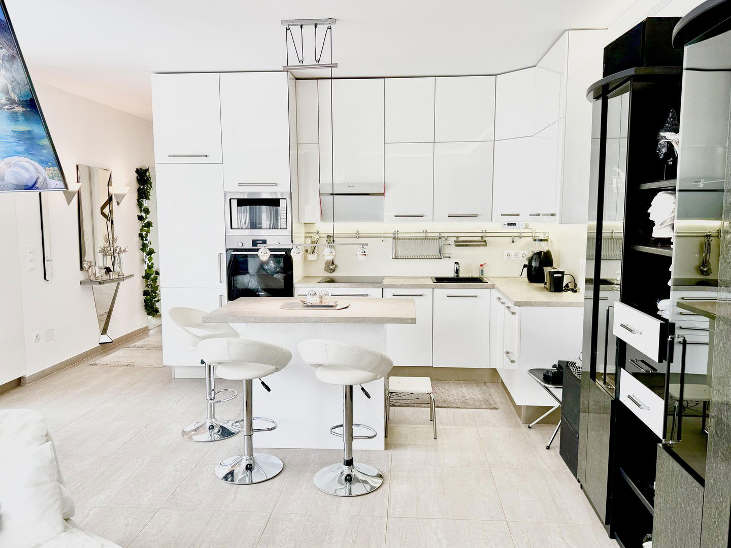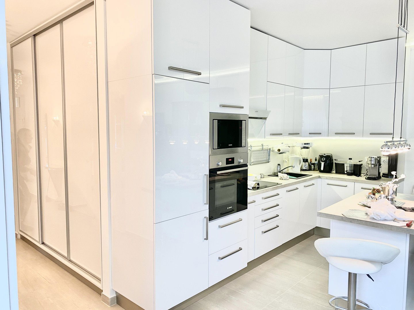Die Einbauküche vom Fachbetrieb reicht bis zur Decke, ist mit hochwertigen Elektrogeräten ausgestattet und nahtlos in das Raumkonzept integriert. Passgenaue Einbauschränke, die in Material und Design exakt auf die Küche abgestimmt wurden, befinden sich sowohl im Schlafzimmer als auch im Flur – sie verbleiben im Haus und bieten viel Stauraum bei klarer Ästhetik.