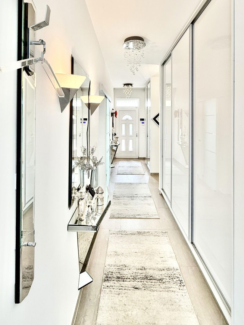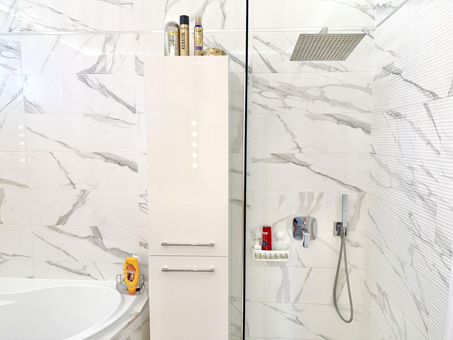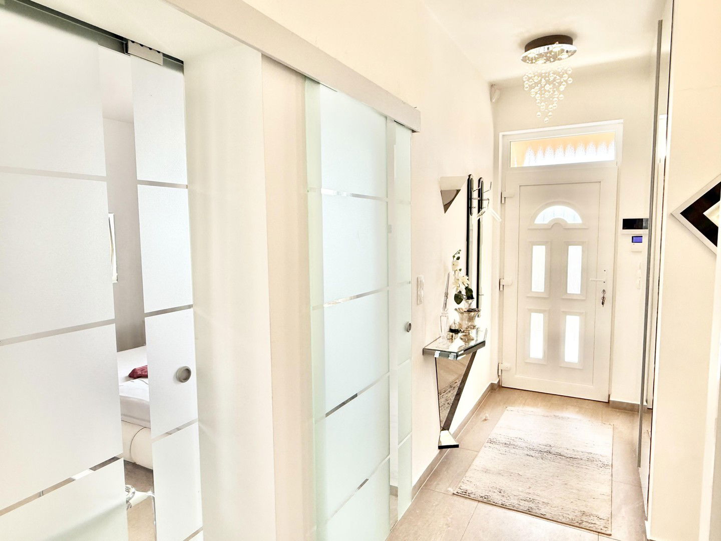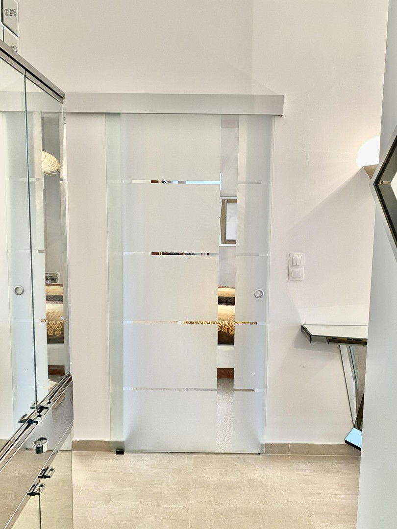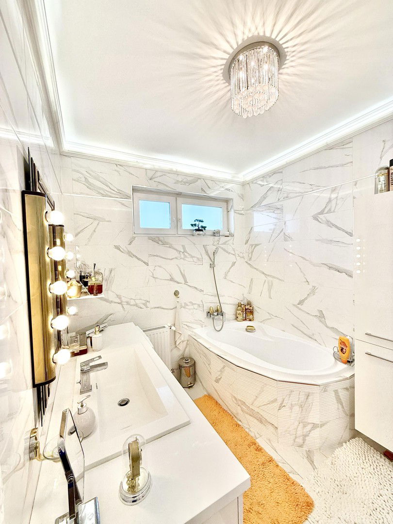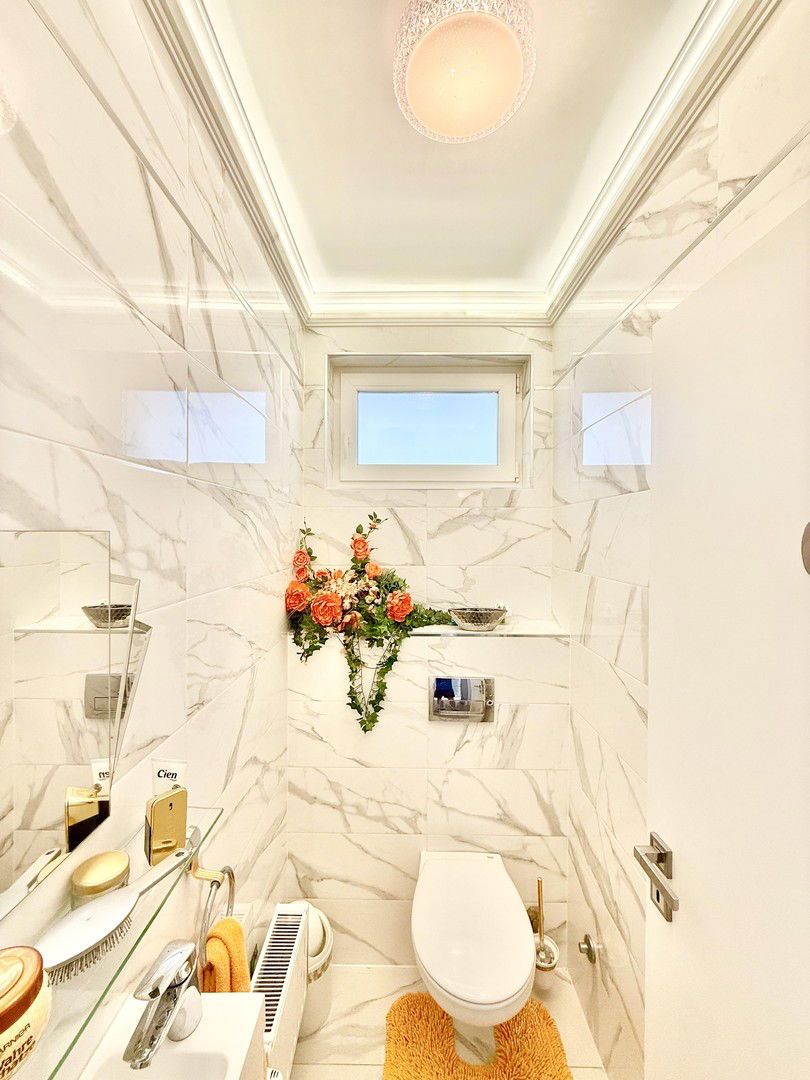 Das Badezimmer ist mit echten Marmorfliesen und hochwertigen Grohe-Armaturen ausgestattet, ebenso das separate WC. Auch die Glastüren im Flur, ausgeführt als elegante Schiebetüren, unterstreichen den modernen und stilvollen Charakter des Hauses.