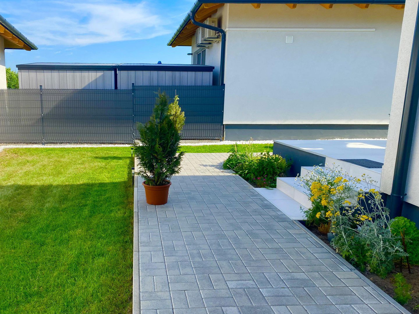 Das Grundstück ist eingefriedet, schön angelegt und mit hochwertigen Pflastersteinen versehen. Platz für Pkw, Gartenfläche, gepflegte Umgebung.