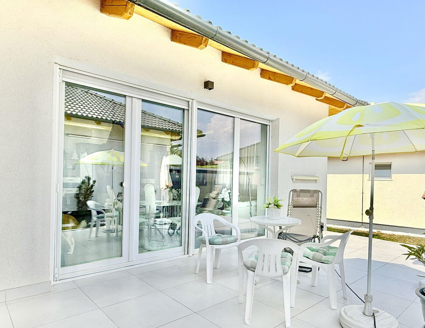 Die Wohnfläche beträgt ca. 107,30?m². Zusätzlich gibt es eine großzügige Terrasse mit über 21?m². Der offene Wohn- und Essbereich ist lichtdurchflutet und geht fließend in die Küche über. Zwei Schlafzimmer, ein modernes Bad mit Dusche und Wanne, ein separates WC sowie hochwertige Einbauschränke machen das Haus sofort bezugsbereit.