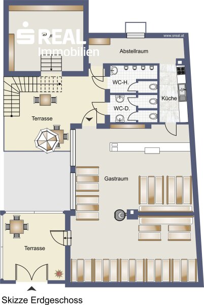 Raumaufteilung Erdgeschoss (ca. 163,80 m²)Ehemaliges Heurigenlokal mit Gastraum, Sanitäranlagen, Küche und Gastgarten