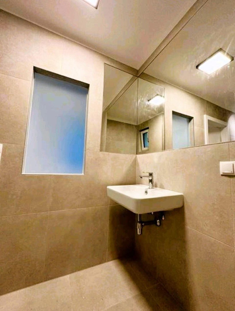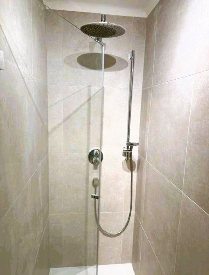 Das Badezimmer ist mit großflächigen Feinsteinfliesen, neuen Sanitäranlagen sowie einer ebenerdigen Dusche mit hochwertigen Armaturen und Glaslichten in Satinato ausgestattet. Natürlich verfügt das Badezimmer über eine Fußbodenheizung.