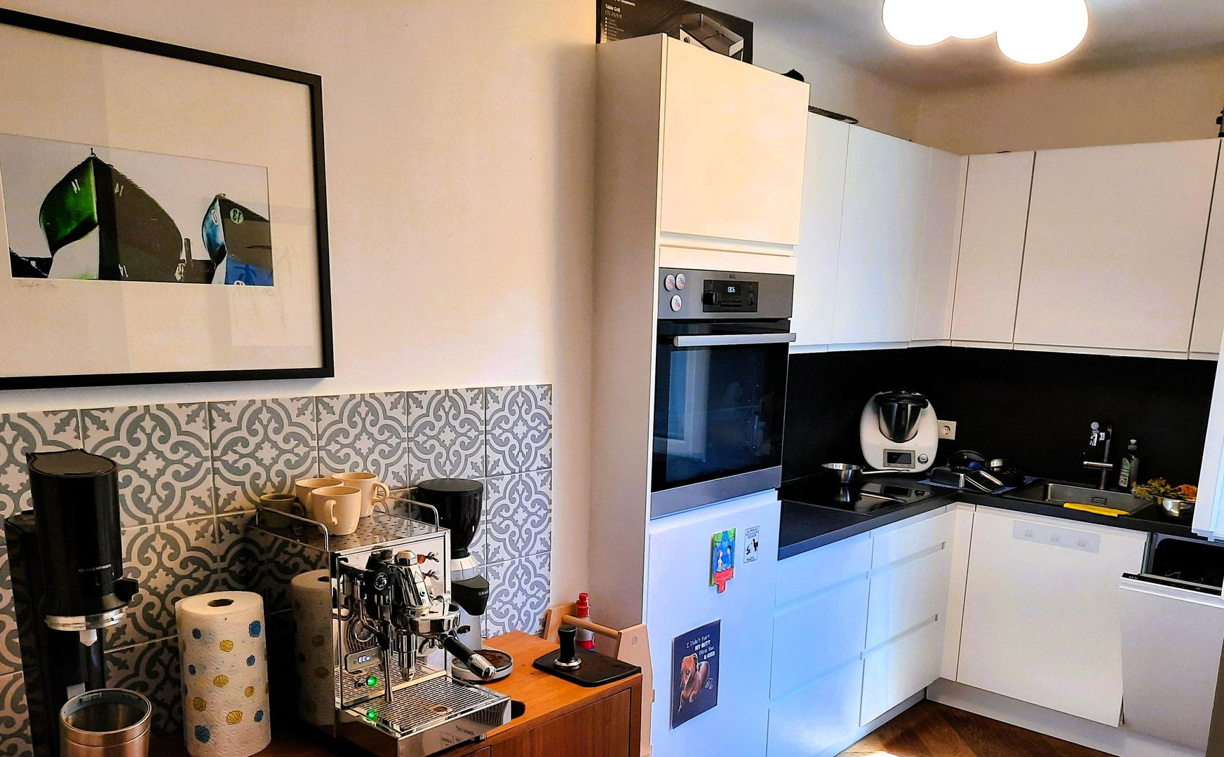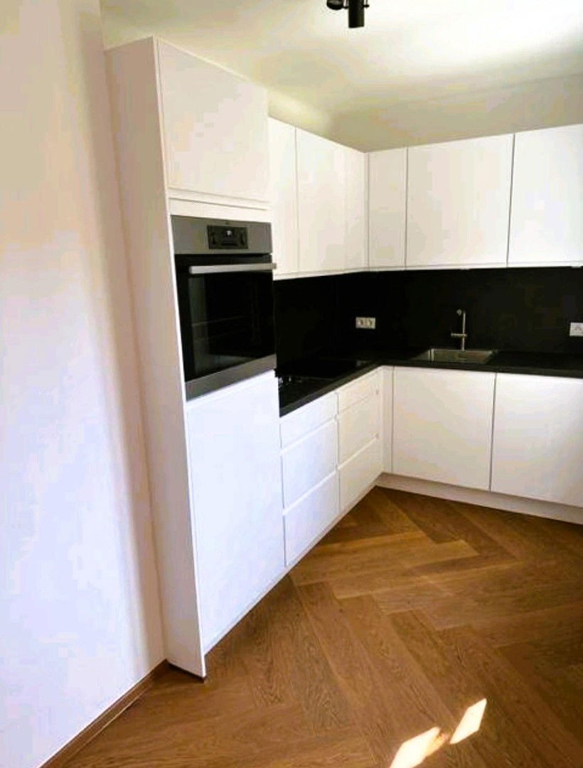 Hochwertige XXL-Fischgrätenböden in Eiche, eine weiße Küche mit AEG-Elektrogeräten und grifflosen Fronten, neue flächenbündige Türen, neue Fenster und Loggiatür3-fach-Verglasung vervollständigen diese Wohnung.