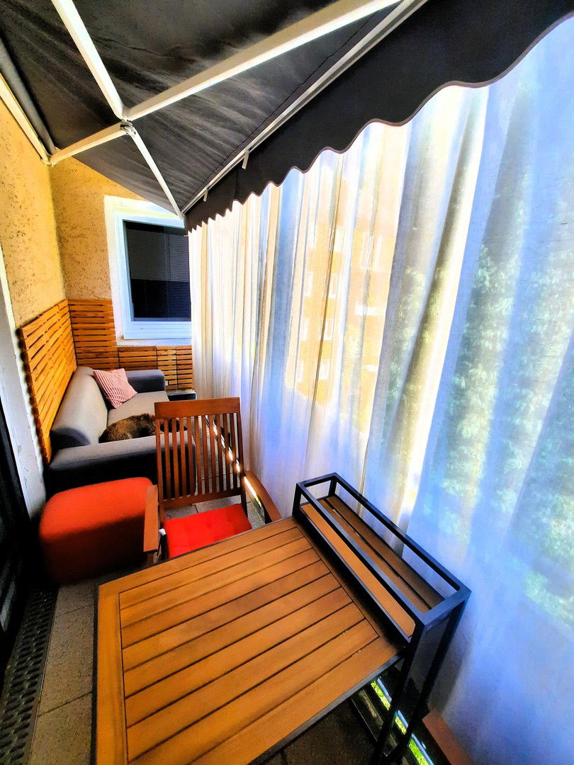 Auf dem Balkon haben Sie durch das durchdachte System mit Markise und Outdoor-Vorhängen ein wunderbares Hyde Away mitten in der Stadt, welches den ganzen Tag zum Verweilen einlädt.