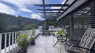 Dieses traumhafte Penthouse in Schönau im Schwarzwald bietet alles, was das Herz begehrt. Mit 3.5 Zimmern und einer Wohnfläche von 106 m² eignet es sich perfekt für Paare oder kleine Familien. Der schnelle Glasfaseranschluss sorgt für modernste Technologie, während die Sonnenterrasse in 3 Himmelrichtungen zum Entspannen einlädt. Die hochwertige Einbauküche und der Doppelparker Tiefgaragenstellplatz bieten zusätzlichen Komfort. Die energieeffiziente Bauweise und die modernen Annehmlichkeiten wie die Pergola und elektrischen Markisen machen dieses Penthouse zu einem echten Juwel. Willkommen in Ihrem neuen Zuhause!