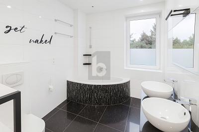 - großes Badezimmer mit Eckbadewanne und Dusch-WC