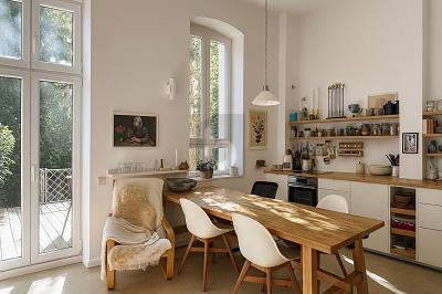 Aus ursprünglich drei Zimmern wurde durch eine Grundrissänderung ein modernes, offenes Raumkonzept mit einer großen Wohnküche. Hochwertige Details wie Fußbodenheizung, Stuckelemente und ein Kaminofen schaffen eine besondere Wohnatmosphäre. Vor der Übergabe wird die Wohnung wieder auf drei Zimmer umgebaut.