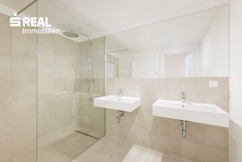 bodengleiche Duschen mit eleganter, verdeckter Abflussrinne Einzel- oder Doppel-Waschbecken mit maßgefertigten Tischler-Unterbau-Regalen durchgehende Fußbodenheizung für behagliche Wärme österreichischer Eichenparkett in Landhausdielen-Optik italienische Feinsteinzeug-Fliesen von l’argilla Vorbereitung für LED-Deckenspots im Vorraum sowie in ausgewählten NebenräumenNachhaltig & zukunftsorientiert: