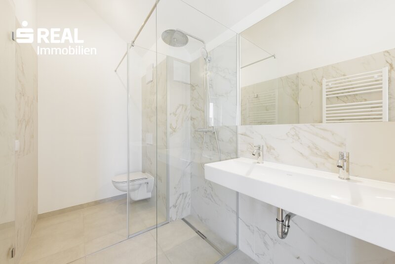 bodengleiche Duschen mit eleganter, verdeckter Abflussrinne Einzel- oder Doppel-Waschbecken mit maßgefertigten Tischler-Unterbau-Regalen durchgehende Fußbodenheizung für behagliche Wärme österreichischer Eichenparkett in Landhausdielen-Optik italienische Feinsteinzeug-Fliesen von l’argilla Vorbereitung für LED-Deckenspots im Vorraum sowie in ausgewählten NebenräumenNachhaltig & zukunftsorientiert: