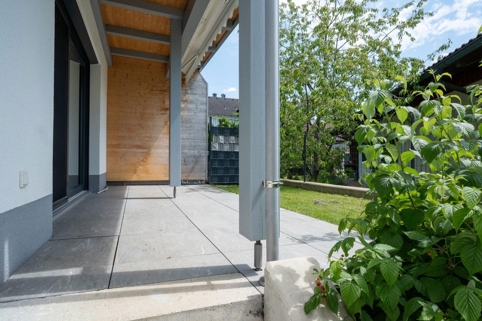 Die große Glasfront mit Schiebetür gibt den Blick auf die überdachte Terrasse frei.