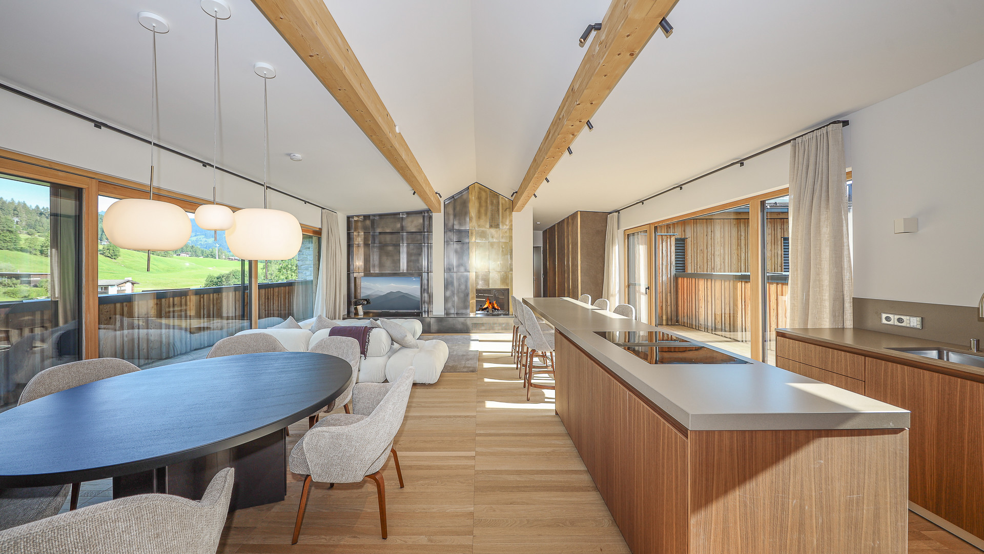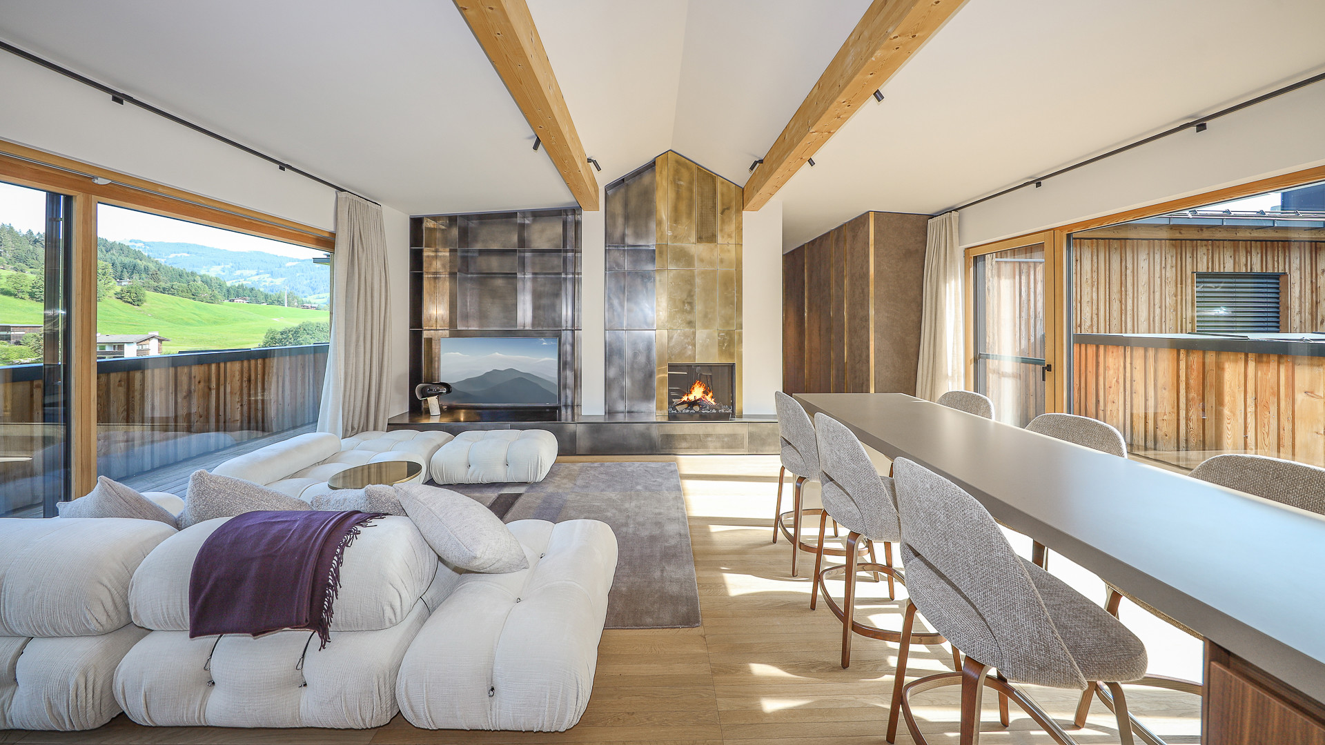 Weiters verfügt das Luxus-Apartment über einen großen Wohnbereich mit Gas-Kamin, offener Designer-Küche und gemütlichem Essbereich.