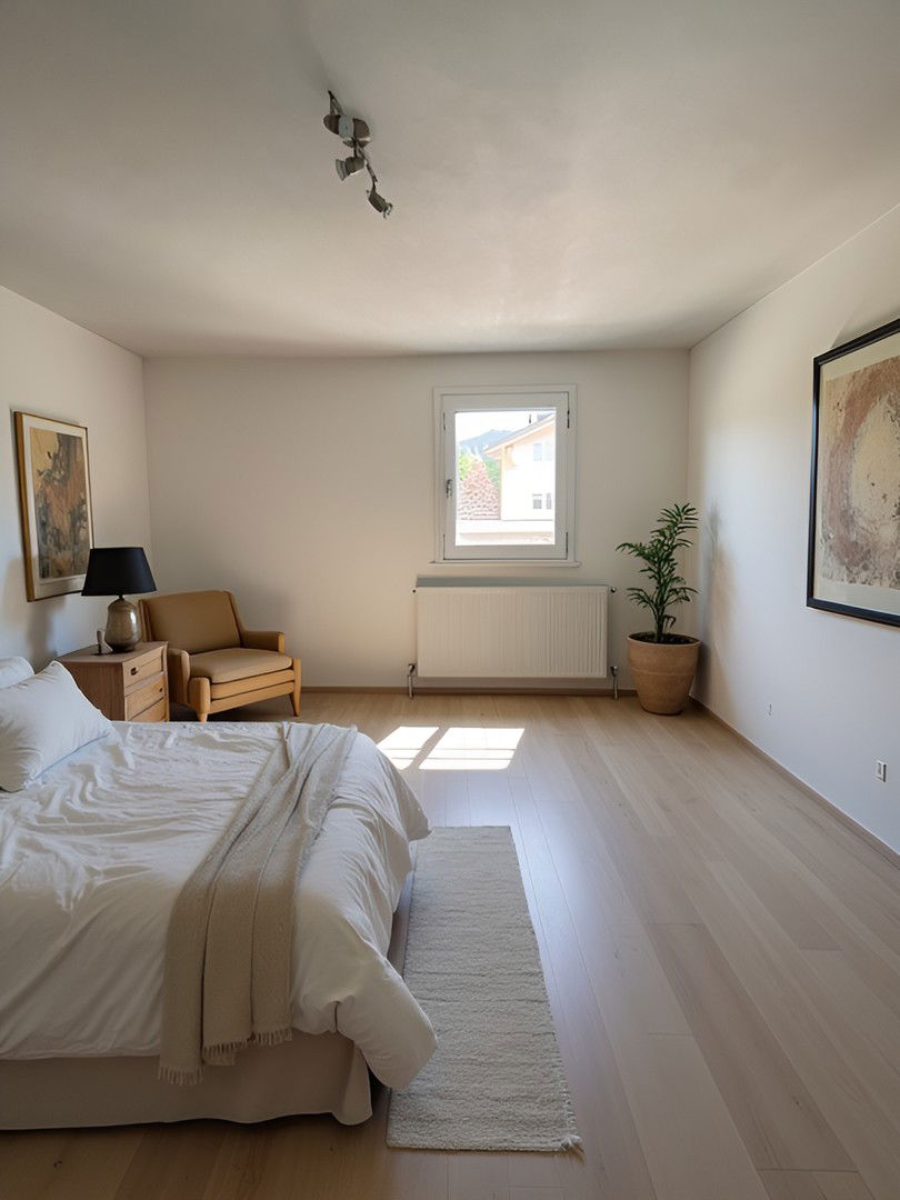 Die Wohnung hat zwei gleich große Schlafzimmer, ein großzügiger Wohn-Essbereich, eine Speisekammer, ein Tageslicht-Badezimmer, sowie ein separates Gäste-WC (auch mit Fenster).