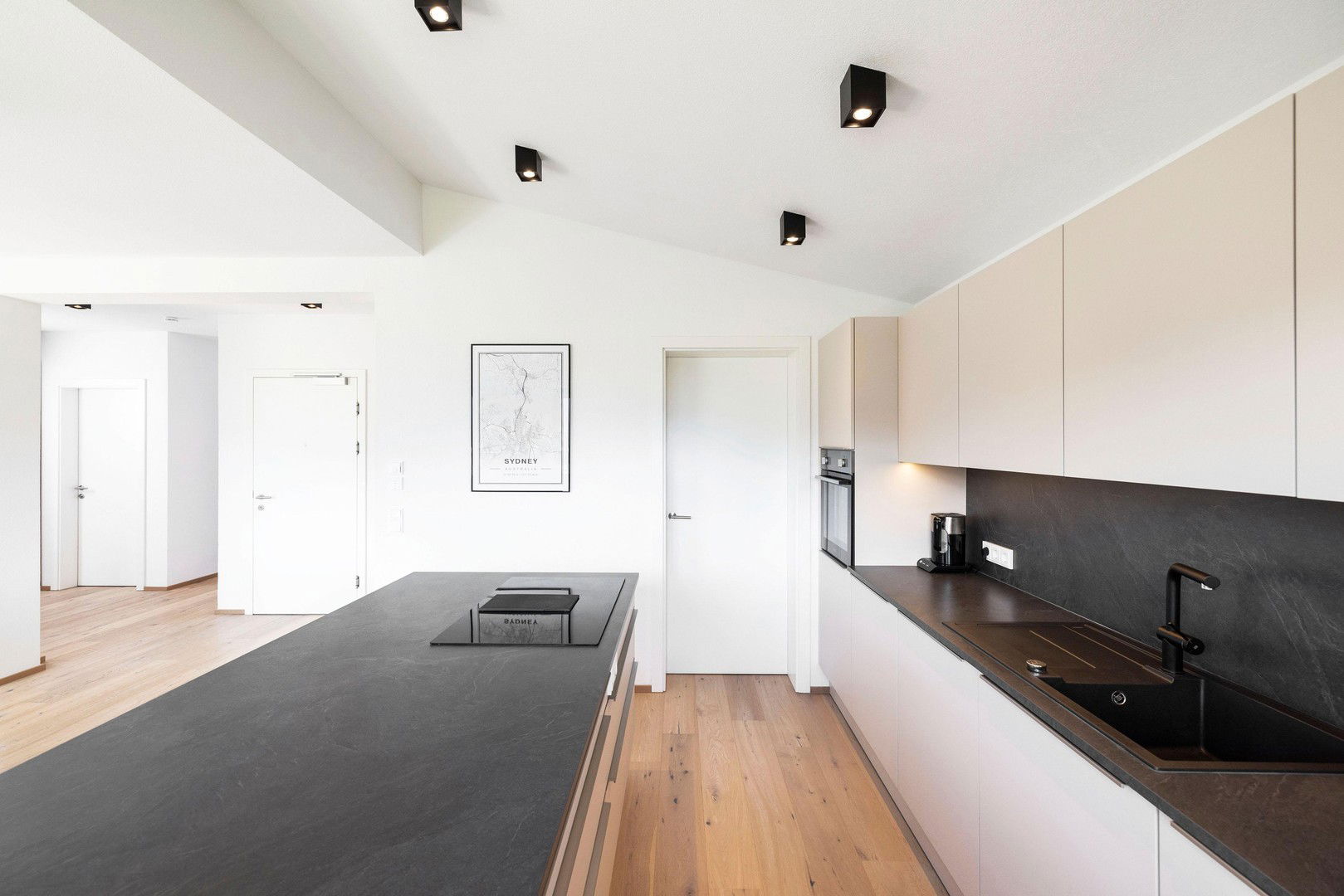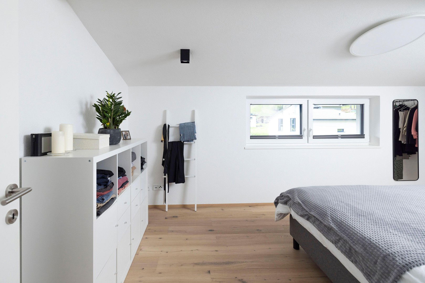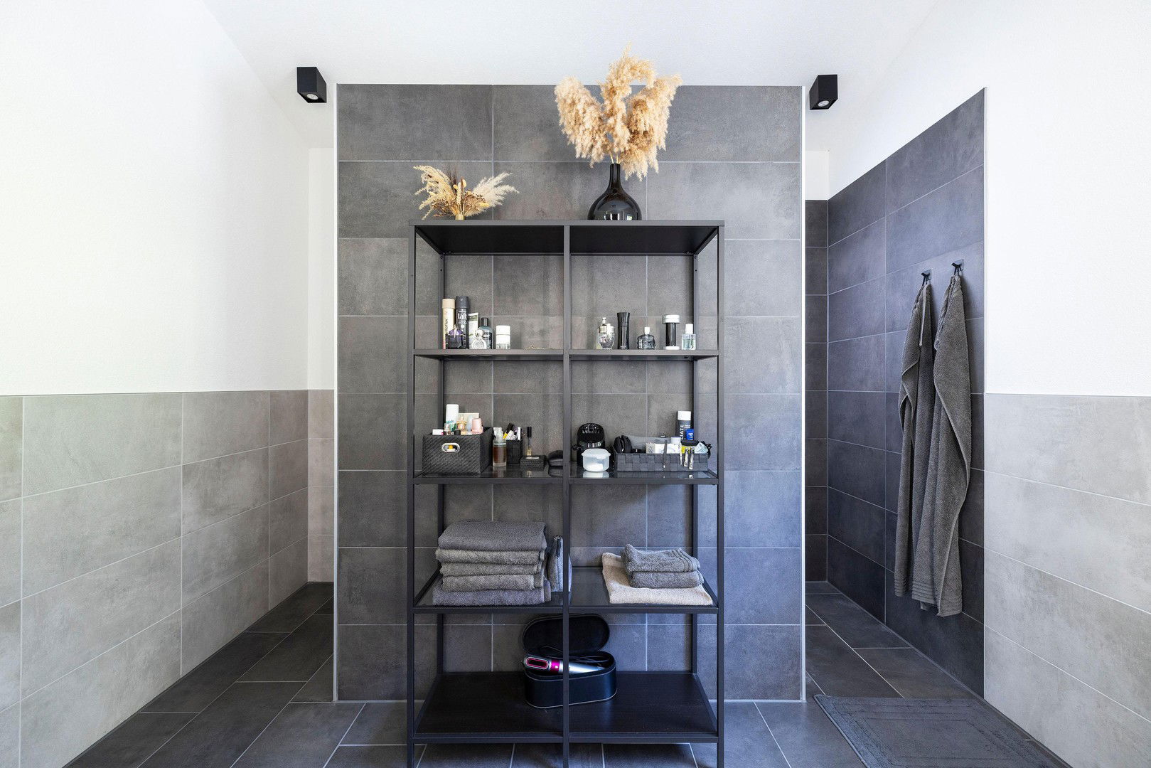 • Fußboden: Feinsteinzeug in den Bädern, Landhausdielen in Eiche im