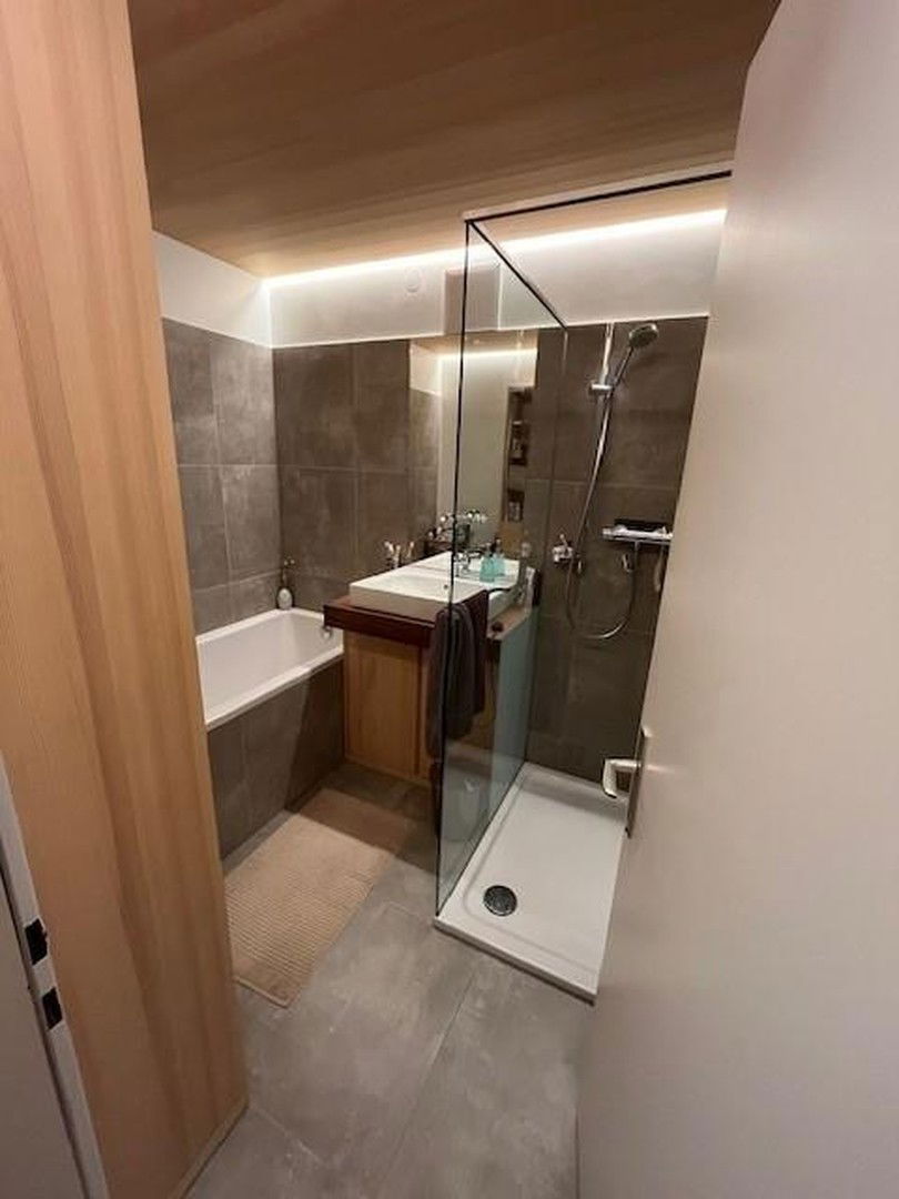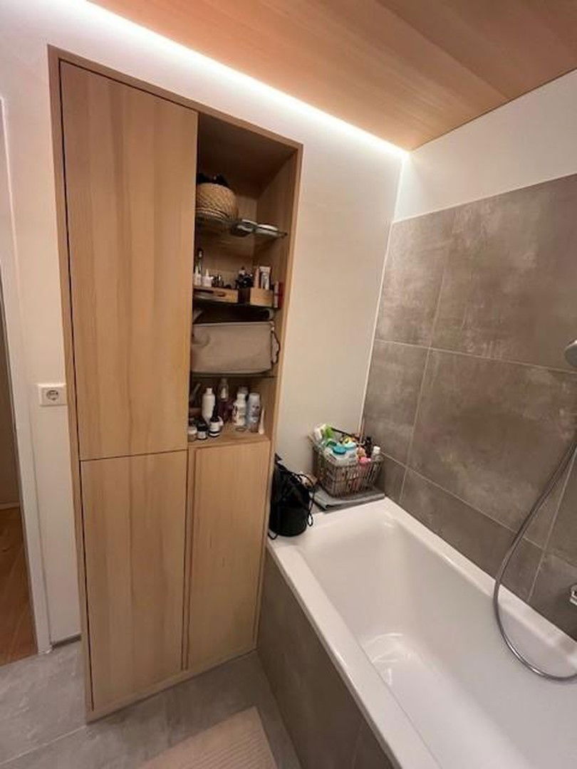Bad: Komplett neu gestaltet mit Badewanne, Dusche, Weißtannen-Decke und maßgefertigten Schreinereinbauschränken