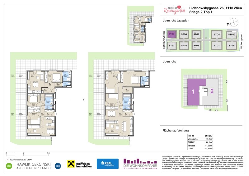 Moderne 2- bis 4-Zimmer-Wohnungen mit großzügigen Balkonen, Terrassen oder Garten Wohnflächen von 45 bis 77/110 ?m² mit hochwertiger Ausstattung Zukunftsorientierte Energieversorgung durch Wärmepumpen und Geothermie Niedrigenergiehaus-Standard: positiver DGNB ÖGNI Pre Check Fußbodenheizung und Fußbodentemperierung (Vorbereitung für Splitklimageräte im Dachgeschoß) Hochwertige Ausstattung: Parkettboden, Feinsteinzeugfliesen Hauseigene Tiefgarage mit 88 Plätzen, E-Tankstellen vorbereitet Großzügige Fahrradräume Kinder- und Jugendspielplatz Ruhige Grünlage mit sehr guter öffentlicher Anbindung Fenster mit 3-Scheiben-Wärmeschutz-Verglasung und elektrischen Außen-Beschattung mittels RaffstoresROSENGARTEN vereint Nachhaltigkeit und Lebensqualität.