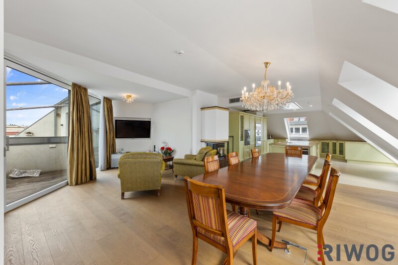STOCKWERK: Oberstes Dachgeschoß mit Lift (1.DG) BAUJAHR: Dachgeschoß Ausbau 2013 BEZIEHBAR: nach Absprache WOHNFLÄCHE: Ca. 183,22 m² TERRASSE: Ca. 31,94 m² (DG 1 = ca 12,3 m² Fläche und DG 2 = 19,5 m² Fläche) ZIMMER: 3 Zimmer MÖBLIERT: die Wohnung ist vollmöbliert (im Kaufpreis enthalten) WASCHMASCHINENANSCHLUSS: Ja (versteckt im Hauptbadezimmer) LIFT: Ja 2 x BADEZIMMER: Hauptbadezimmer (Badewanne, Doppelwaschbecken, Dusche, Sauna, WM-Anschluss) kl Badezimmer (Dusche, Waschbecken, WC) WC: 1x separates WC DG1 und 1x separates WC DG2 HEIZUNG: Gasetagenheizung - Fußbodenheizung KELLERABTEIL: Ja (ca 20m² Fläche) KÜCHE: Komplettküche (Kühlschrank, Geschirrspüler, Backofen, Dunstabzug, Dampfgarer, Weinkühlschrank, Kücheninsel) AUSSTATTUNG: Eichenparkettboden, hochwertige Fliesen in den Bädern und WC, Wasseranschluss auf der Terrasse, Gegensprechanlage mit Kamera, Klimageräte in allen Aufenthaltsräumen, Außenverschattung, elektrische Markise auf der TerrasseKAUFPREIS: 2.150.000,- €