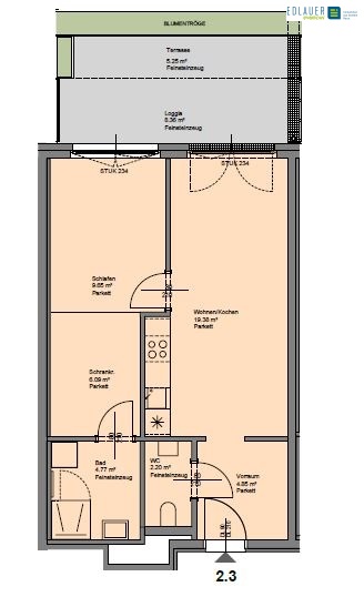 Die Wohnung ist mit einer attraktiven, funktionellen Küche samt E-Geräten, tollen Sanitäranlagen und weitgehend mit Parkettboden ausgestattet.