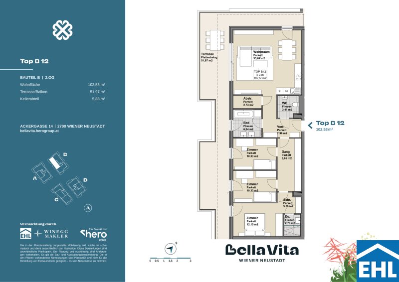 In Wiener Neustadt erwartet Sie ein modernes, einladendes Zuhause, das höchsten Wohnansprüchen gerecht wird. Das Projekt umfasst vier harmonisch in die grüne Umgebung eingebettete Baukörper. Durch ein sorgfältig durchdachtes Grünraumkonzept entsteht eine naturnahe Atmosphäre, die Ruhe und Erholung in den Mittelpunkt stellt.
