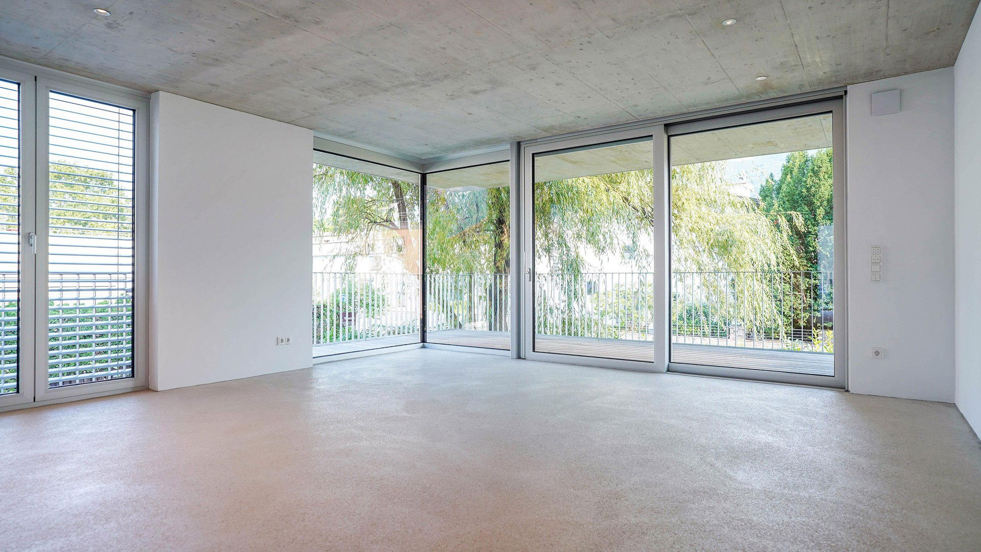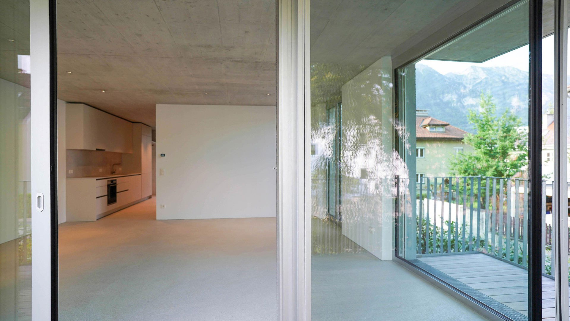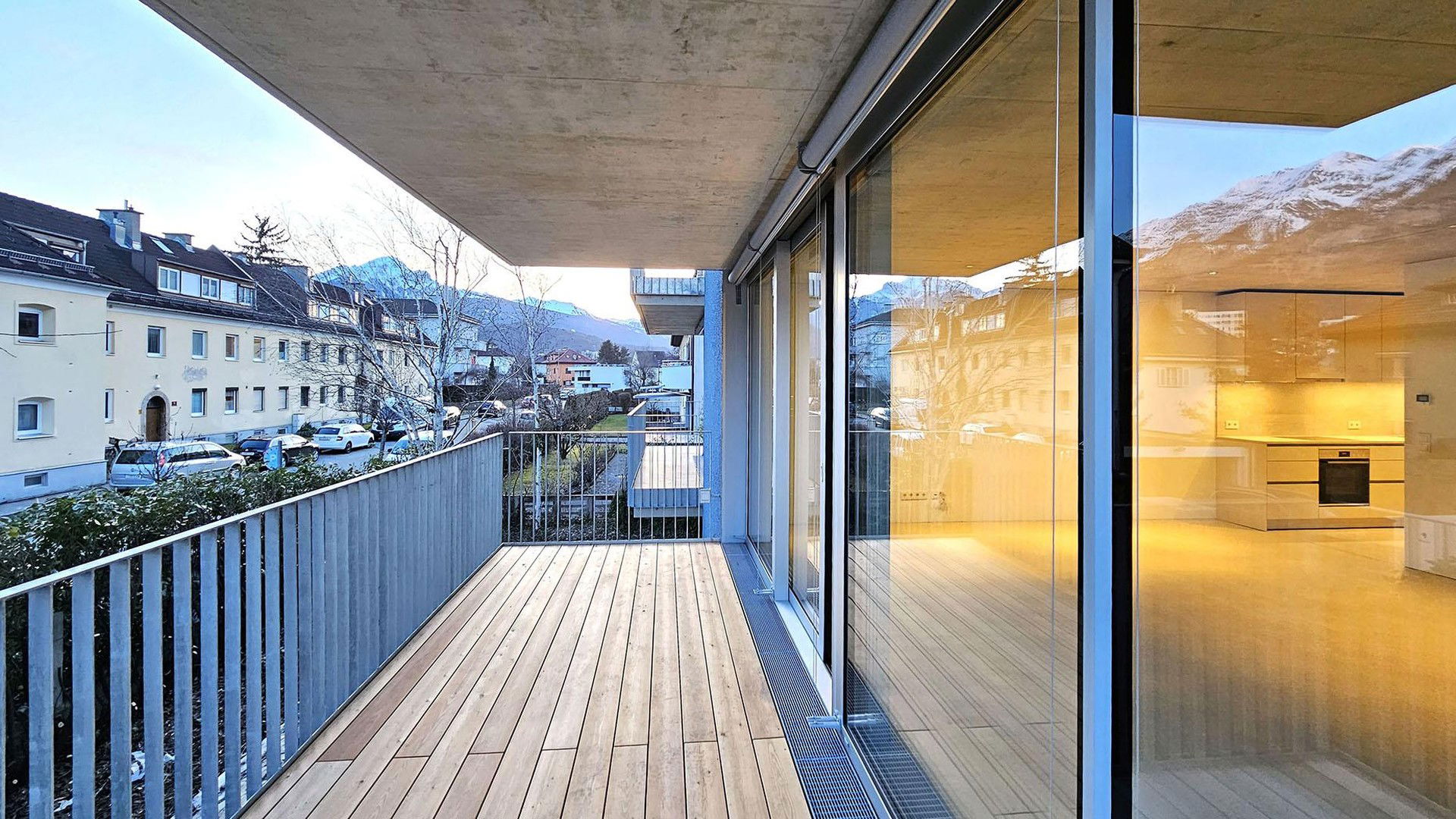 Die Wohnung verfügt über 59?m² Wohnfläche mit klarer, funktionaler Raumaufteilung. Raumhohe Türen tragen zu einer stilvollen Erscheinung und einem großzügigen Raumgefühl bei. Raumhohe Fenster sorgen für maximalen Lichteinfall. Die über Eck verlaufende Wohnzimmerverglasung sorgt für eine fließende Erweiterung des Wohnzimmers in den großzügigen Balkon mit 15 m², welcher einen zwei Meter tiefen Aufenthaltsbereich mit Bergblick bietet und durch den Baumbestand und die gepflegten Grünflächen direkt am Grundstück zusätzlich aufgewertet wird. Das Schlafzimmer öffnet sich über ein raumhohes französisches Balkonfenster nach außen und bietet Raum für ein Doppelbett sowie eine breite Kastenfront.
