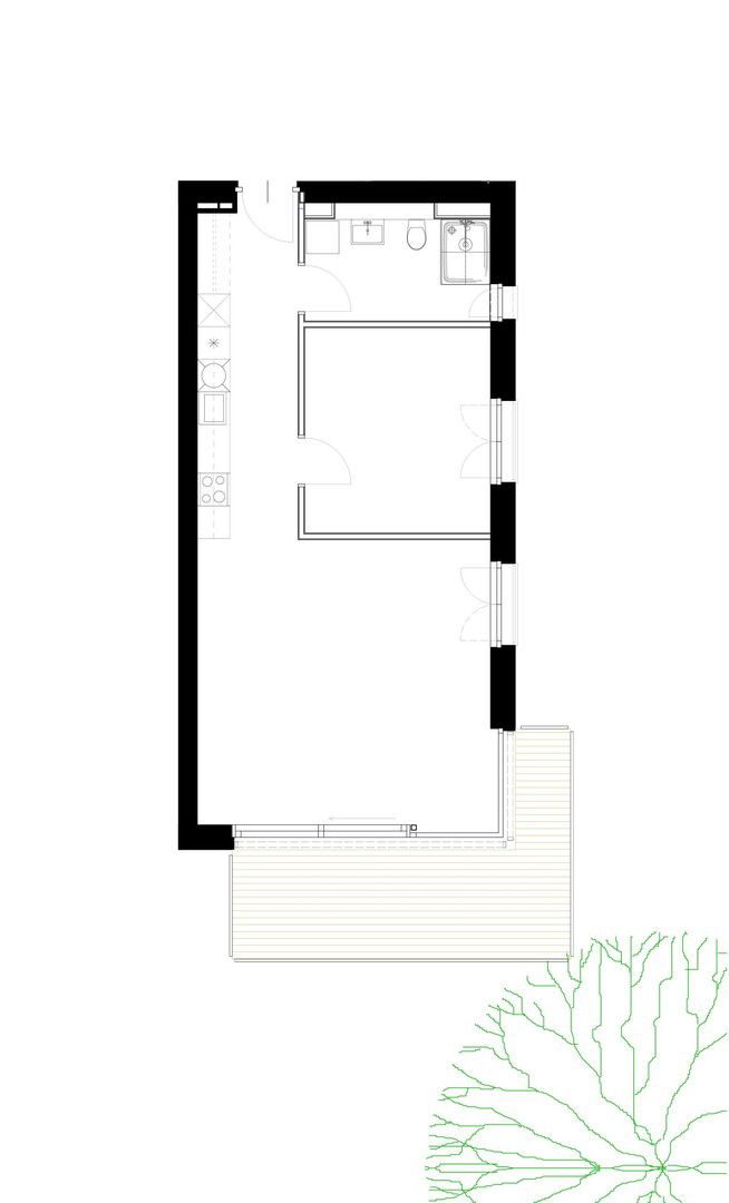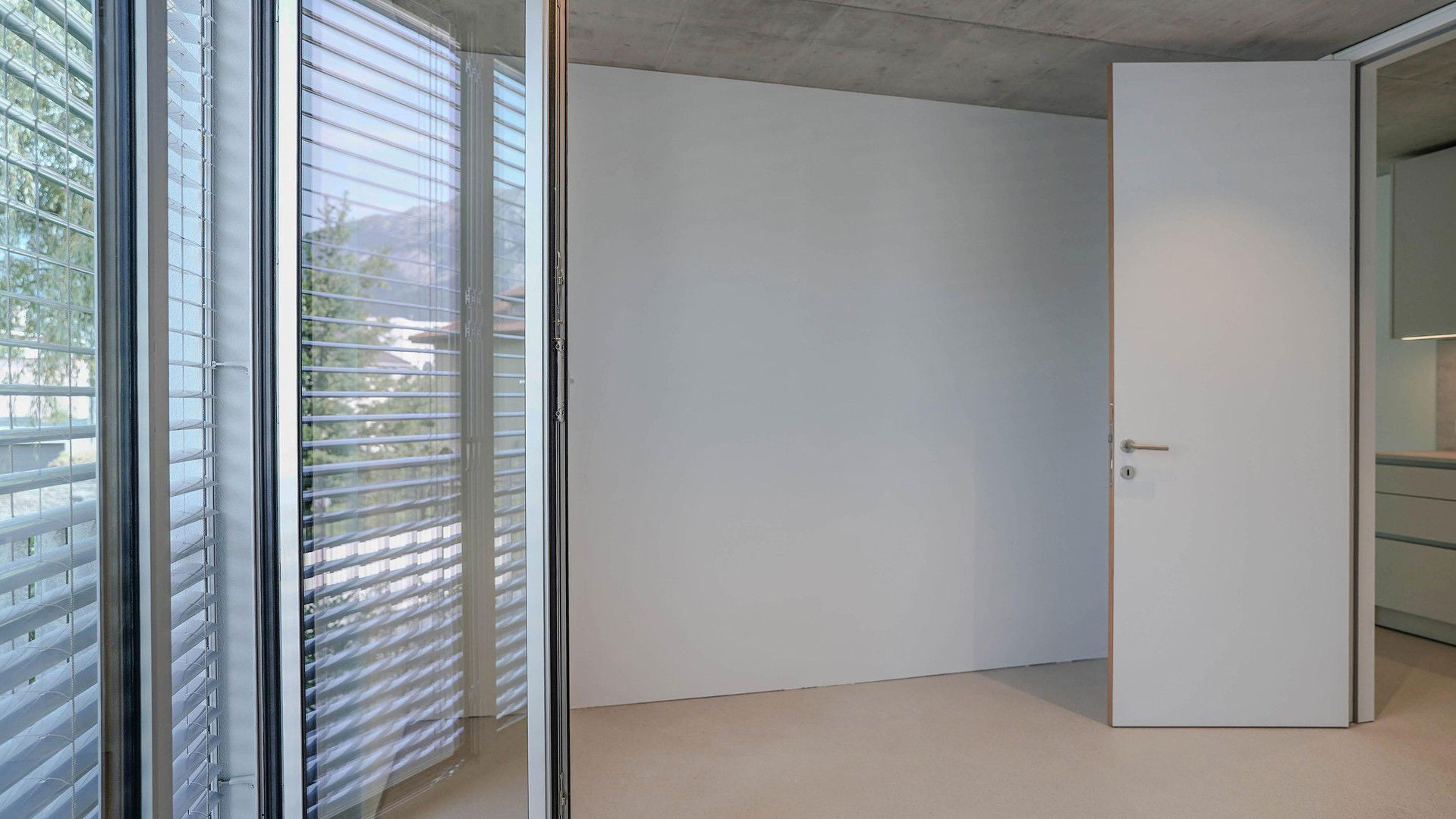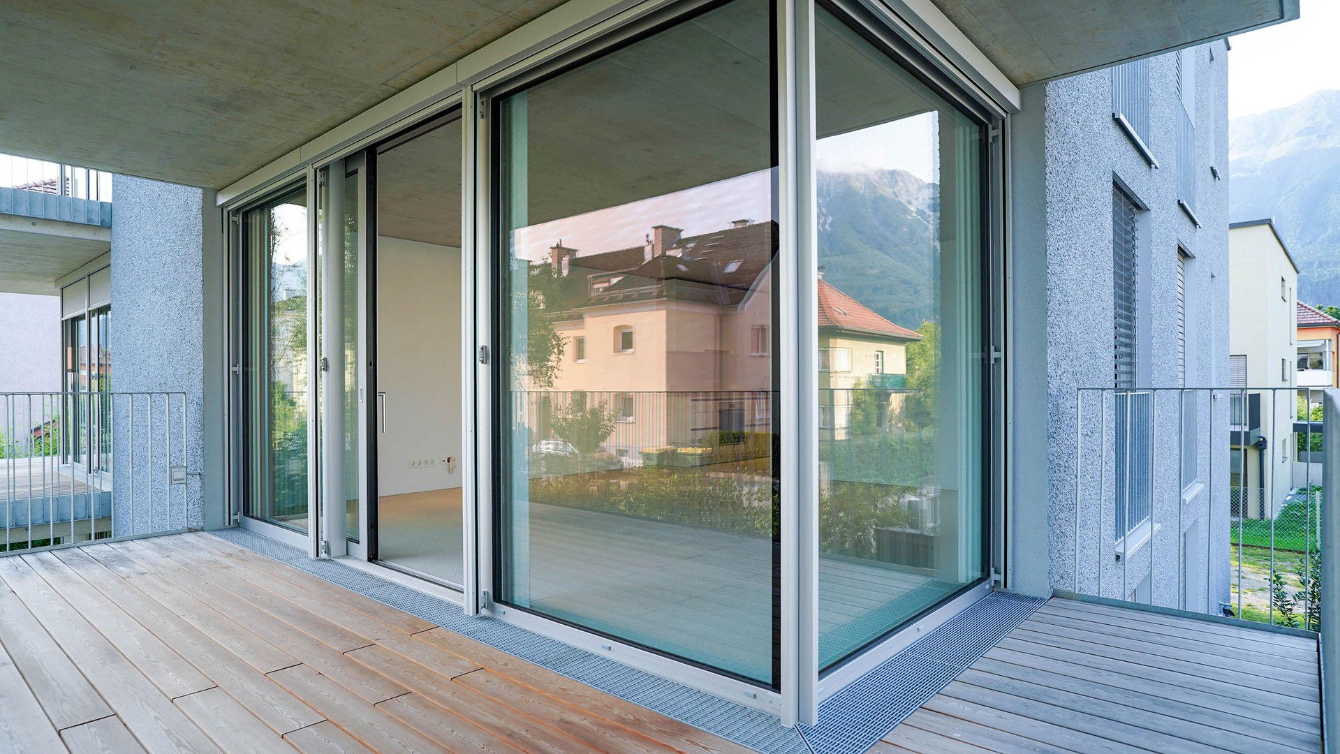 Die Wohnung verfügt über 59?m² Wohnfläche mit klarer, funktionaler Raumaufteilung. Raumhohe Türen tragen zu einer stilvollen Erscheinung und einem großzügigen Raumgefühl bei. Raumhohe Fenster sorgen für maximalen Lichteinfall. Die über Eck verlaufende Wohnzimmerverglasung sorgt für eine fließende Erweiterung des Wohnzimmers in den großzügigen Balkon mit 15 m², welcher einen zwei Meter tiefen Aufenthaltsbereich mit Bergblick bietet und durch den Baumbestand und die gepflegten Grünflächen direkt am Grundstück zusätzlich aufgewertet wird. Das Schlafzimmer öffnet sich über ein raumhohes französisches Balkonfenster nach außen und bietet Raum für ein Doppelbett sowie eine breite Kastenfront.