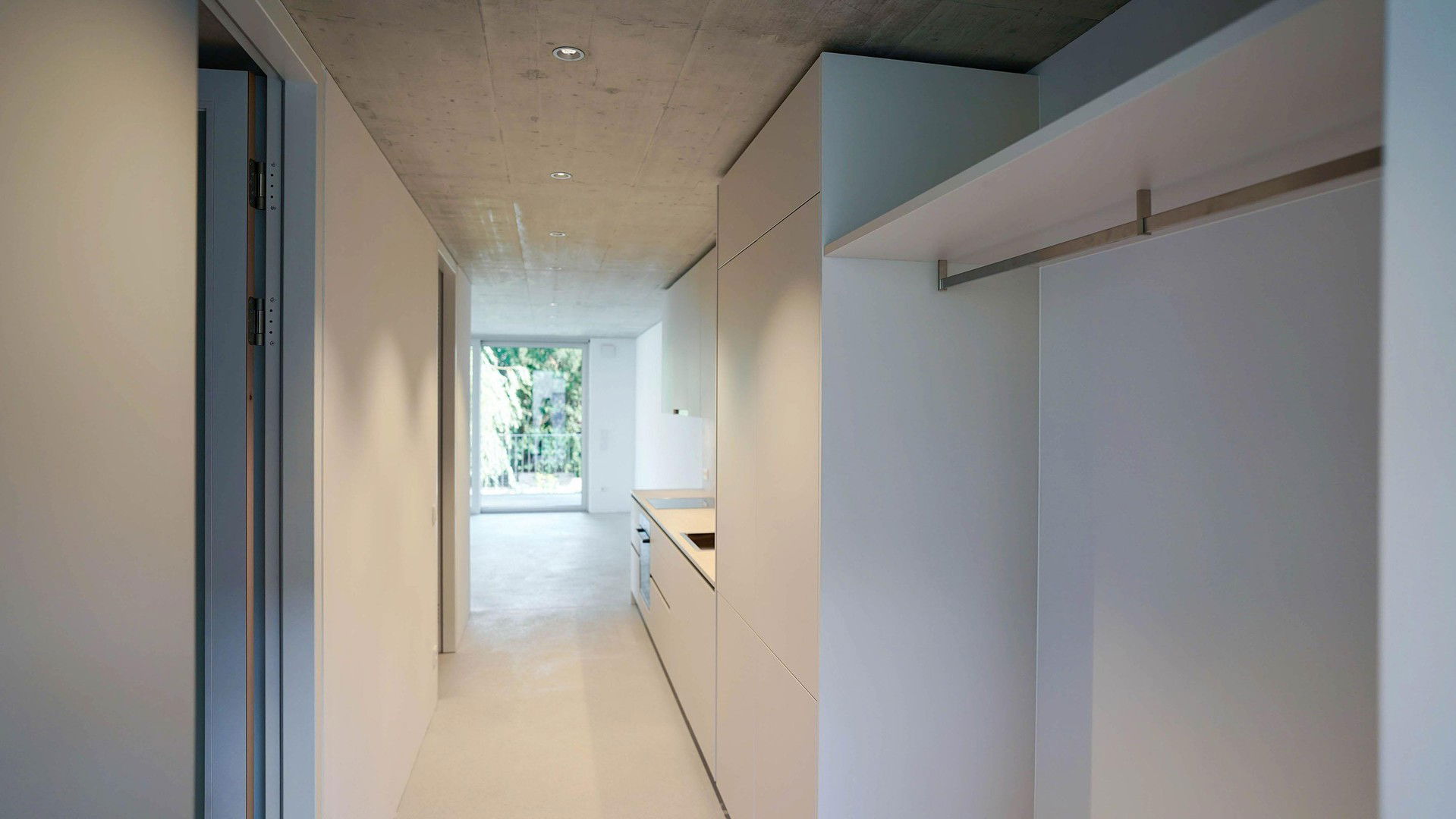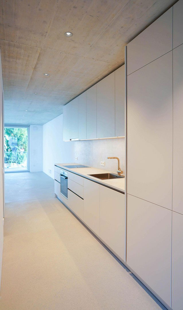 Im Wohnungseingangsbereich befindet sich eine Garderobe mit Ablagefläche und ein Haushaltsschrank. Der Küchenbereich ist dem Wohnbereich vorgelagert und mit einer Einbauküche in raumhoher Ausführung ausgestattet. Das in Feinsteinzeug ausgeführte Badezimmer bietet eine bodenbündige Dusche mit rahmenloser Glastrennwand, einen deckenhohen Spiegel, großzügige Ablageflächen und einen Handtuchtrockner. Hochwertige Deckeneinbauspots sorgen für eine angenehme Raumbeleuchtung in der gesamten Wohnung.