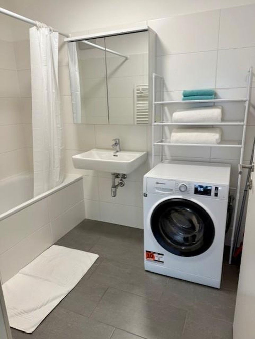 Badewanne mit Duschvorhang, Spiegel- Oberschrank mit Beleuchtung, beheizter Handtuschhalter.