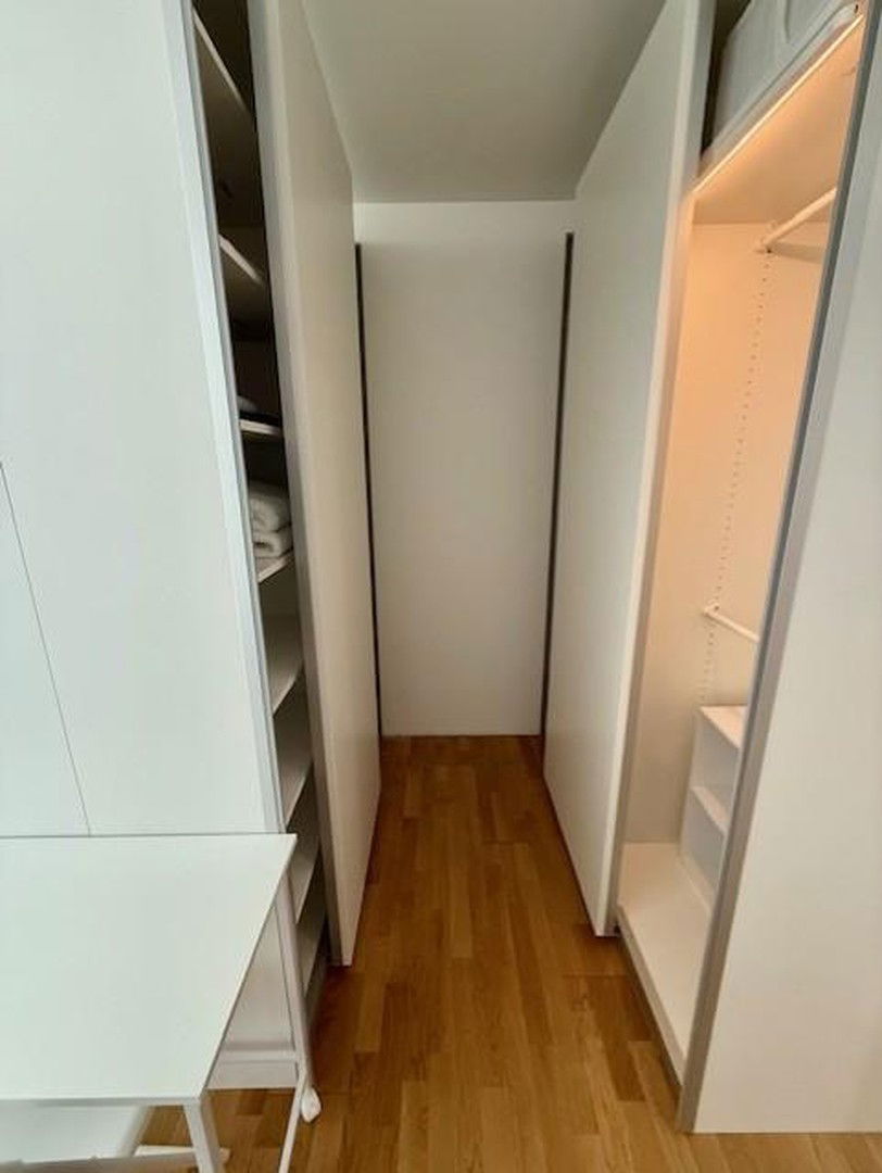 Großer Schrankbereich 2 Kästen 60cm tief, 4 Kästen 40cm tief. An der Stirnseite befindet sich ein kleiner Schreibtisch und ein Hängeregal.