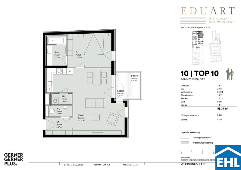 Die Wohnung selbst verfügt über einen Wohnraum mit vollausgestatteter Küche, ein getrennt begehbares Schlafzimmer, ein Badezimmer mit Badewanne, ein separates WC, einen Abstellraum, sowie einen Vorraum. Der ostseitige Balkon lädt zu gemütlichen Stunden im Freien ein.
