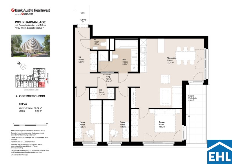Fernwärme mittels Fußbodenheizung Fußbodenkühlung moderne Eichenparkettböden in den Wohnräumen vollausgestattete Einbauküchen mit Miele Geräten hochwertiges Feinsteinzeug in den Nassräumen außenliegender Sonnenschutz mittels Raffstores in jedem Raum hochqualitative LAUFEN Produkte in den Sanitärräumen Waschmaschinenanschlüsse in jeder Wohnung hörerlose Audio/Video-GegensprechanlagenDas Objekt verfügt über 2 Aufzüge, einen Kinderwagenraum, sowie einen Fahrradabstellraum.